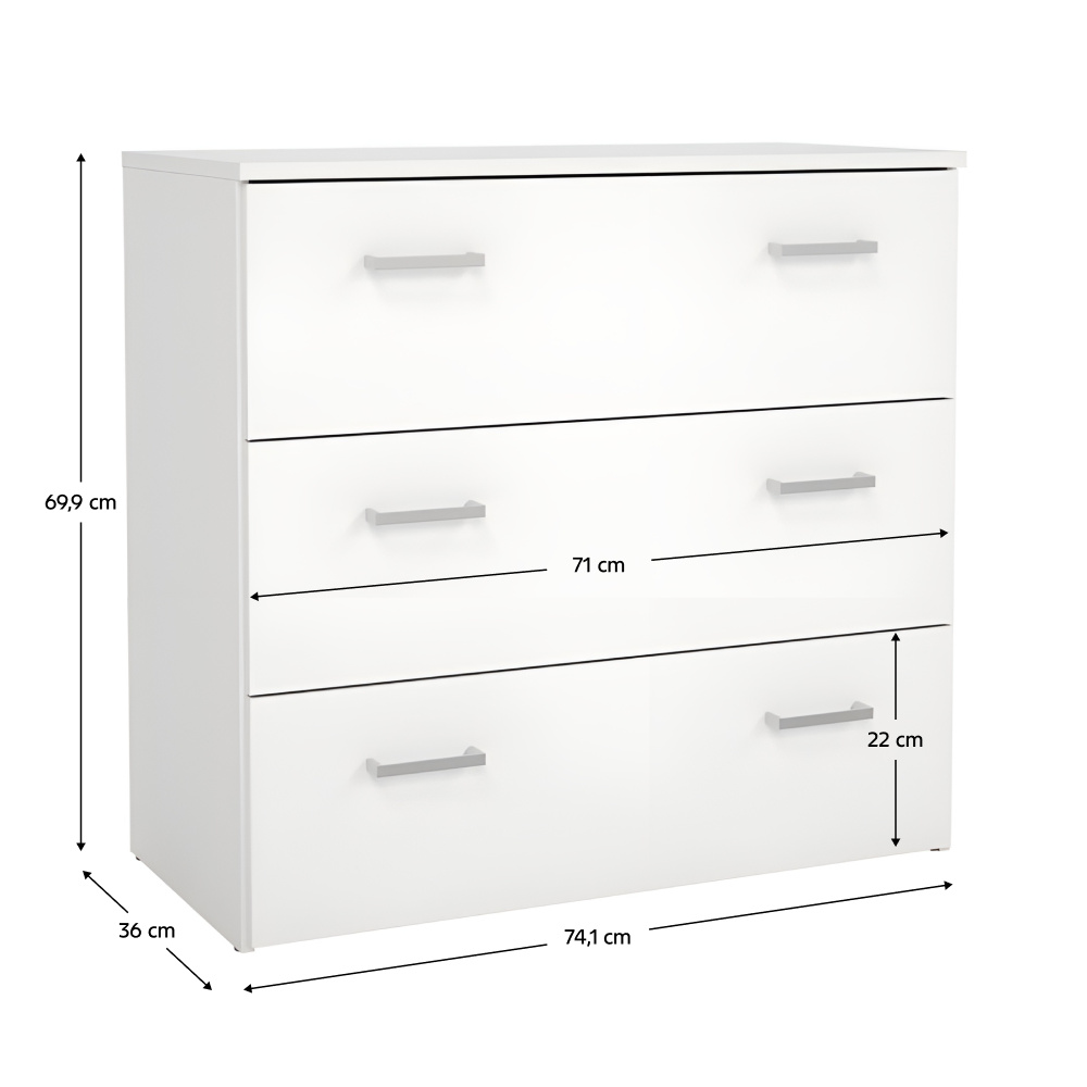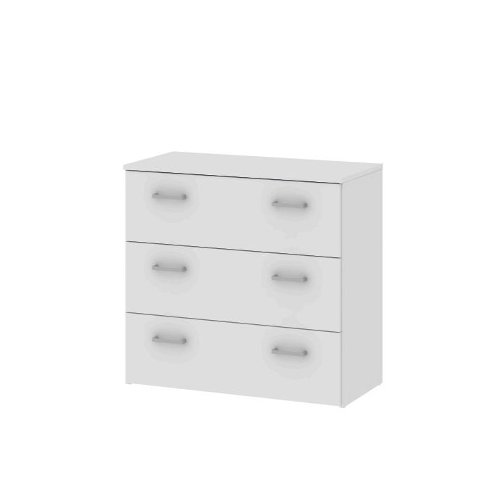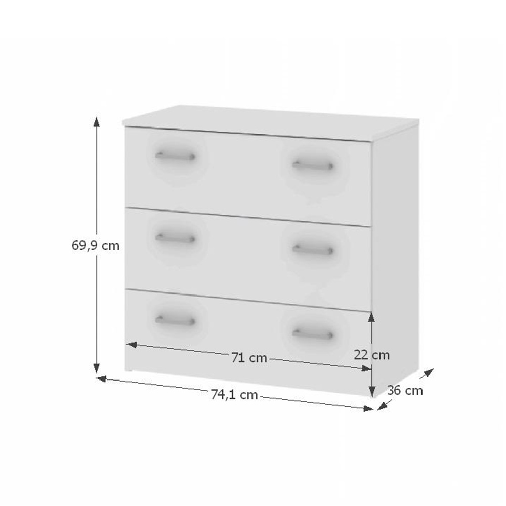 Komoda GARBO 3 Materiál: DTD laminovaná Provedení: bílá Rozměry komody (ŠxHxV): 74,1x36x69,9 cm Rozměry šuplíku (ŠxV): 71x22 cm Tloušťka materiálu korpus: 12 mm Tloušťka materiálu vrchní plát: 15 mm 3 šuplíky Dodávané v demontu.