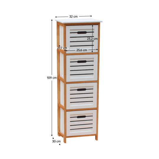 Materiál: MDF / masivní dřevo Barva: bílá / přírodní Rozměry (ŠxHxV): 32x30x109 cm čtyři šuplíky Vnější rozměry šuplíku (ŠxHxV): 25,6x27,7x23,2 cm Vnitřní rozměry šuplíku (ŠxHxV): 23,6x25,2x22 cm Dodávané v demontu.