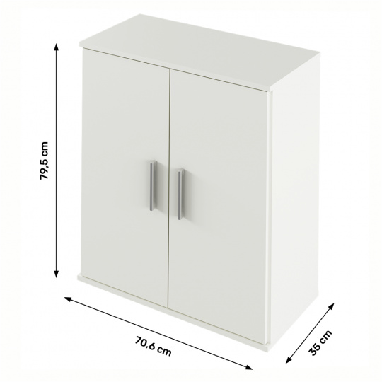 Materiál: DTD laminovaná Barva: bílá Rozměry (ŠxHxV): 70,6x35x79,5 cm dvoudveřová policová S úchytkami Dodávané v demontu