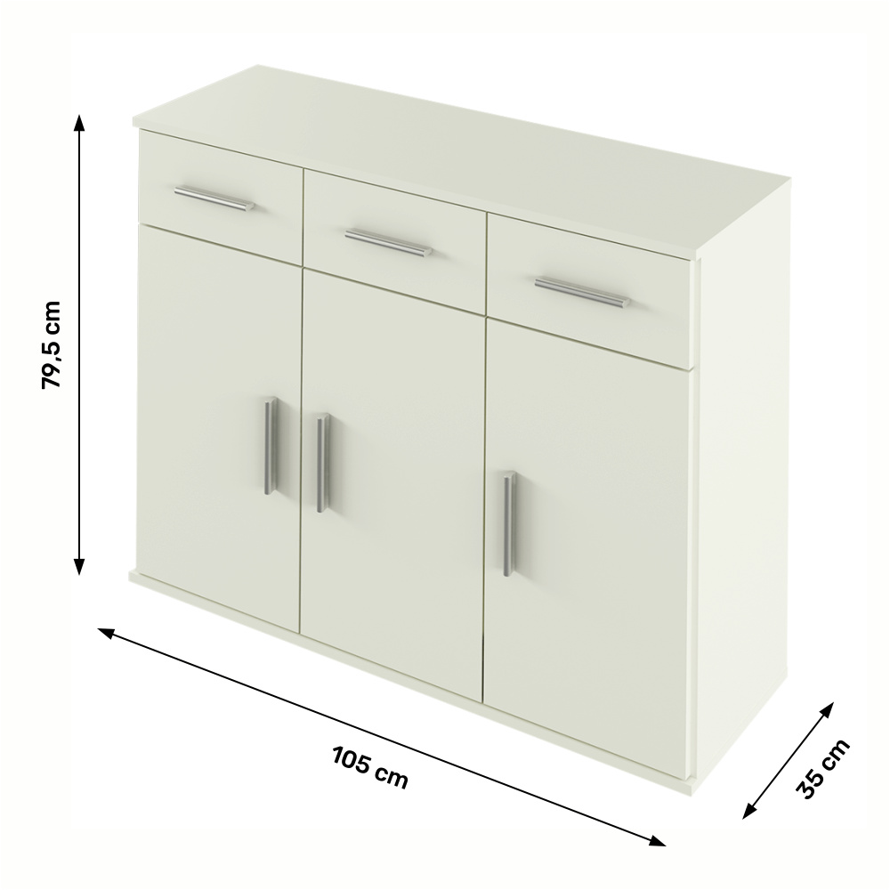 Materiál: DTD laminovaná Barva: bílá Rozměry (ŠxHxV): 105x35x79,5 cm třídveřová tři skříňky tři šuplíky S úchytkami Dodávané v demontu
