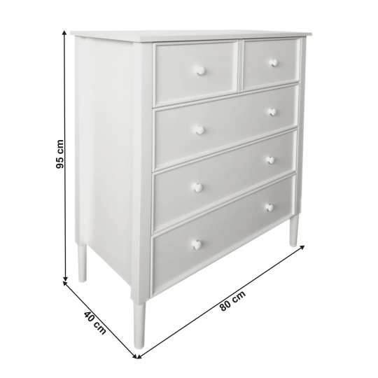 Materiál: MDF Barva: bílá Rozměry (ŠxHxV): 80x40x95cm Tloušťka materiálu: 1,5 - 3,7 cm Tři větší šuplíky Dva menší šuplíky Dřevěné úchytky Barva úchytek: bílá Nosnost: 30 kg Nosnost šuplíku: 10 kg Na nožičkách Výška nožiček: 15 cm Doporučujeme připevnit ke zdi Provensálský styl Dodáváno v demontu