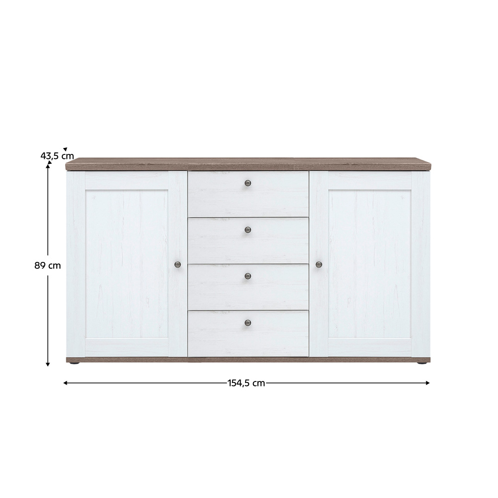 Materiál: laminovaná DTD Barva: borovice canyon/dub sonoma trufel Rozměry (ŠxHxV): 154,5x43,5x89 cm Tloušťka materiálu: 1,6 cm S úchytkami Materiál úchytek: kov Barva úchytek: staré stříbro 4 šuplíky Nosnost šuplíku: 3 kg Dvoudveřová 2 skříňky Policová Nosnost police: 5 kg Moderní design Doporučujeme připevnit ke zdi Dodáváno v demontu