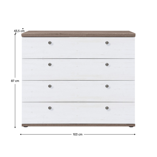 Materiál: laminovaná DTD Barva: borovice canyon/dub sonoma trufel Rozměry (ŠxHxV): 103x43,5x87 cm Tloušťka materiálu: 1,6 cm S úchytkami Materiál úchytek: kov Barva úchytek: stará stříbrná 4 šuplíky Nosnost šuplíku: 3 kg Moderní design Doporučujeme připevnit ke zdi Dodáváno v demontu