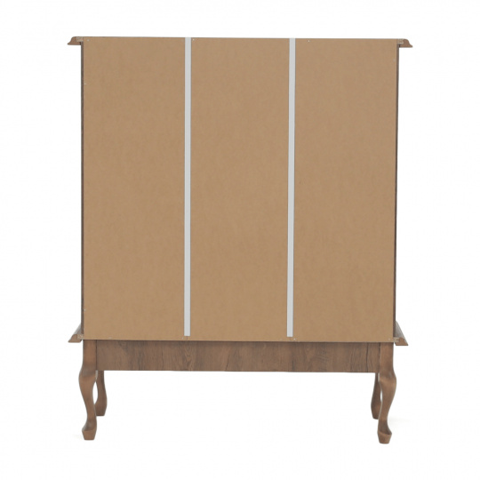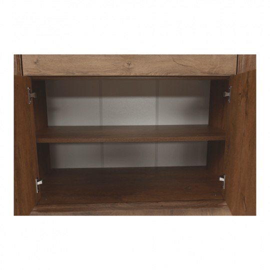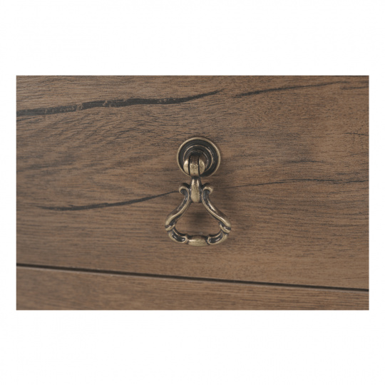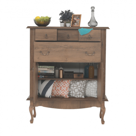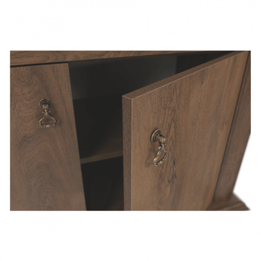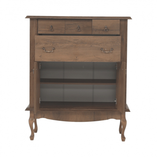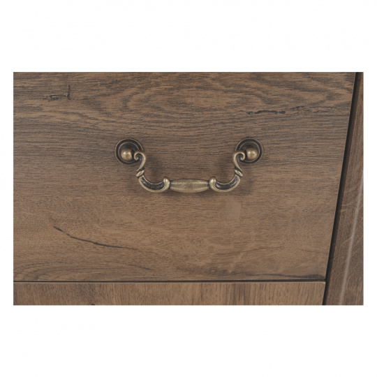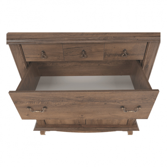 Materiál: DTD laminovaná / ABS hrany Barva: dub lefkas Rozměry (ŠxHxV): 105x47x125 cm Výška spodního prostoru od podlahy: 25 cm Tloušťka materiálu: 30 mm čtyři šuplíky 3D efekt kovové úchytky Dřevěné nožičky ABS hrany barokní styl