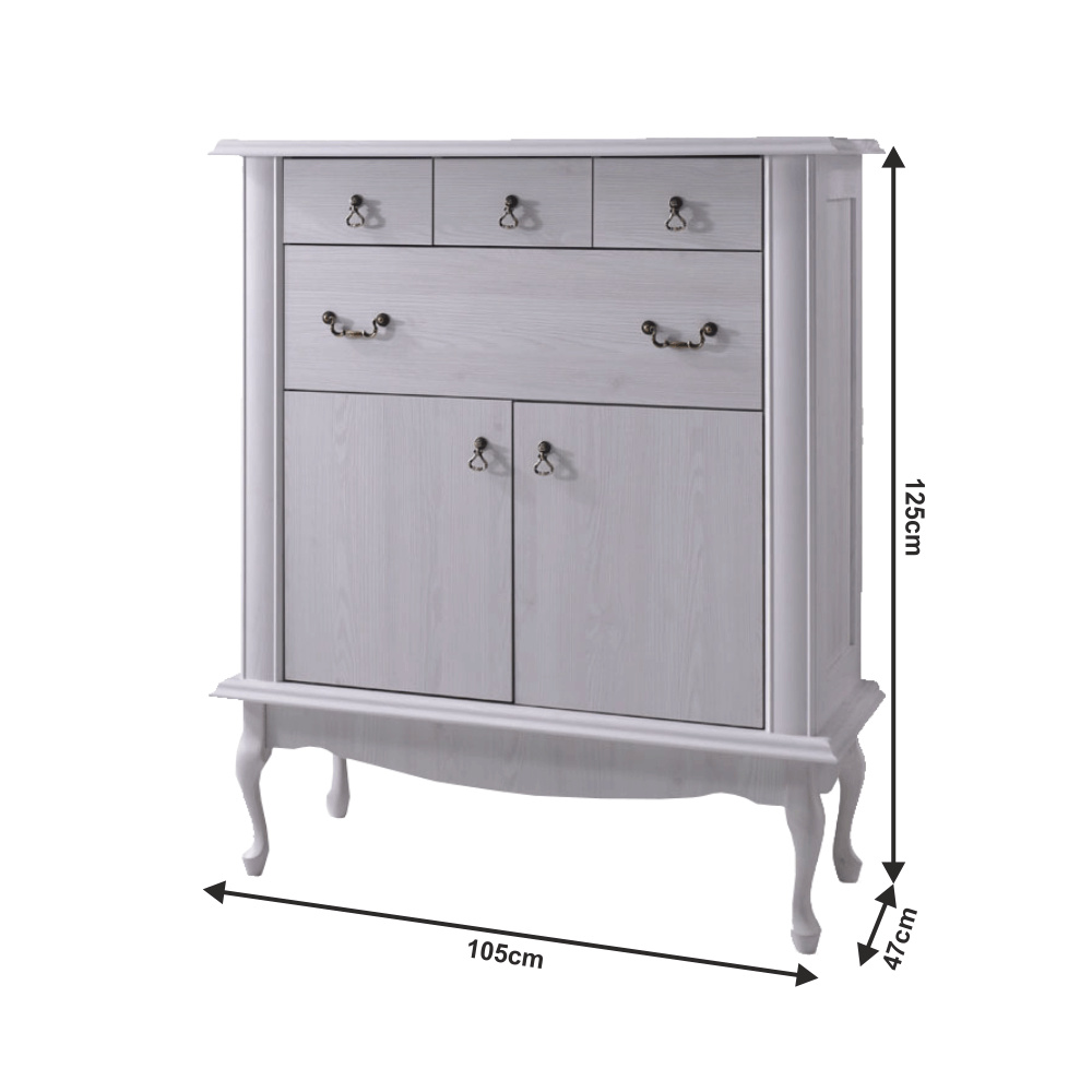 Materiál: DTD laminovaná / ABS hrany Barva: sosna bílá Rozměry (ŠxHxV): 105x47x125 cm Výška spodního prostoru od podlahy: 25 cm Tloušťka materiálu: 30 mm čtyři šuplíky 3D efekt kovové úchytky Dřevěné nožičky ABS hrany barokní styl