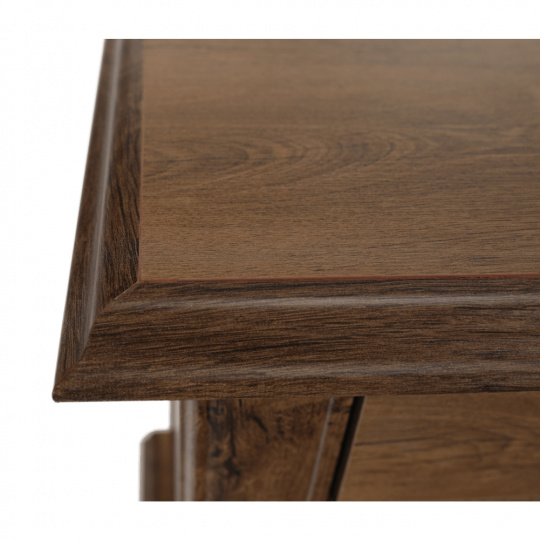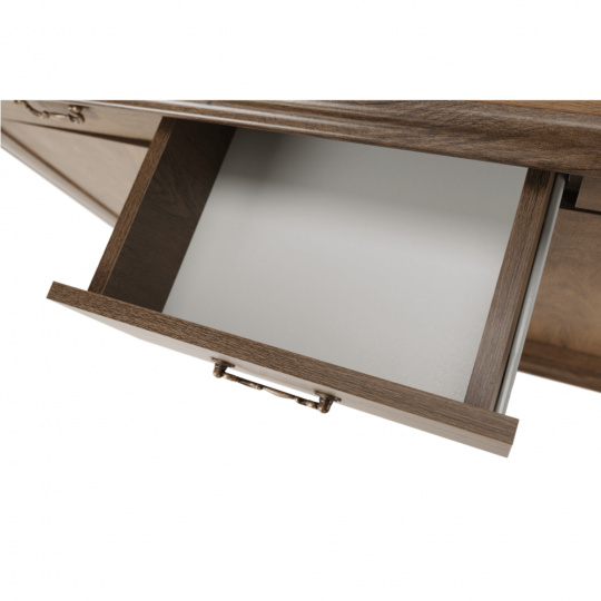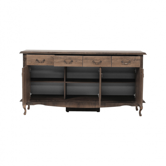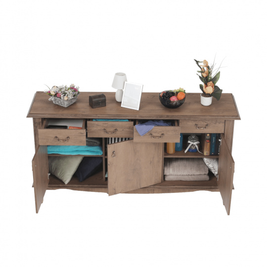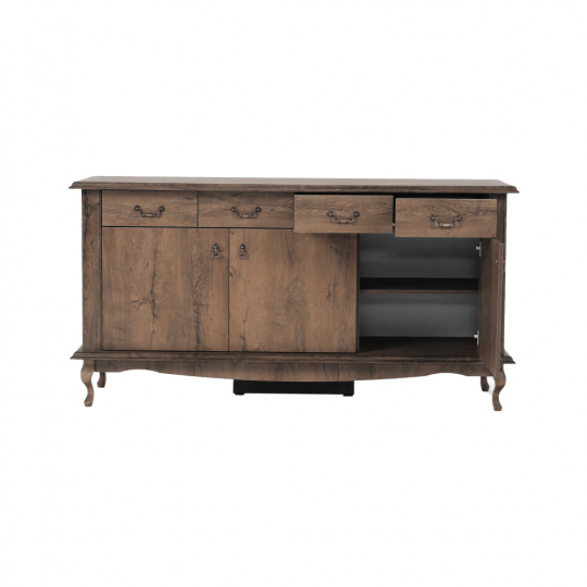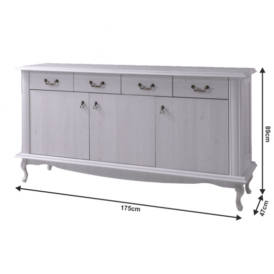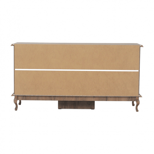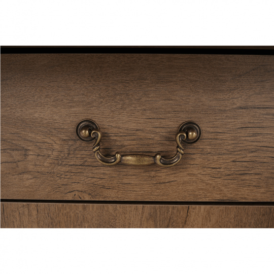 Materiál: DTD laminovaná / ABS hrany Barva: dub lefkas Rozměry (ŠxHxV): 175x47x89 cm Výška spodního prostoru od podlahy: 15 cm Tloušťka materiálu: 30 mm dvě skříňky čtyři šuplíky 3D efekt kovové úchytky Dřevěné nožičky ABS hrany barokní styl