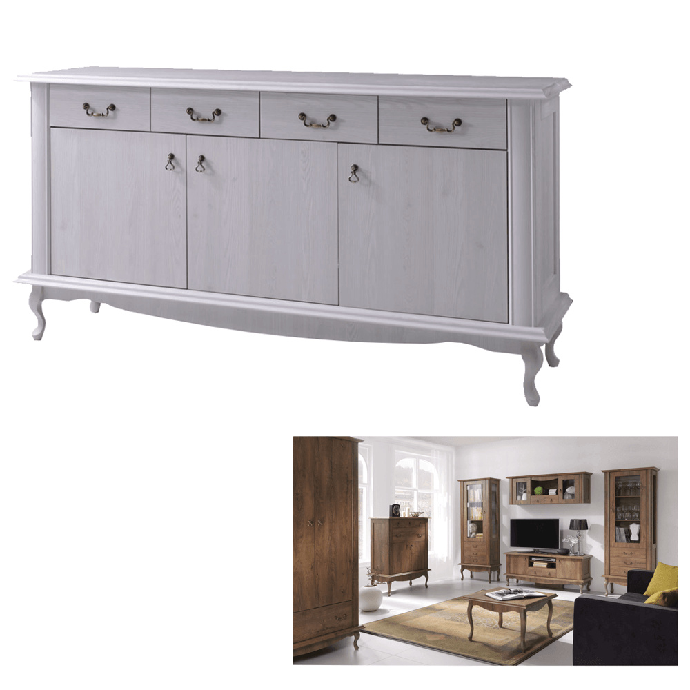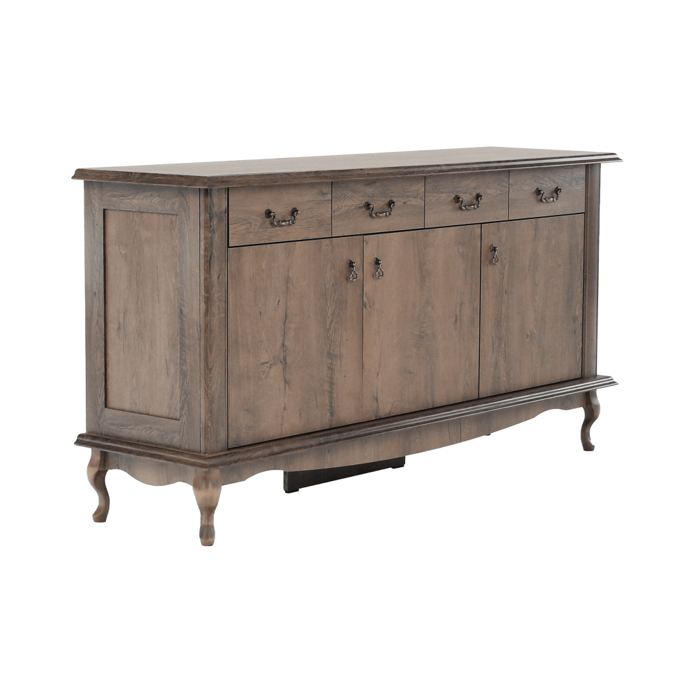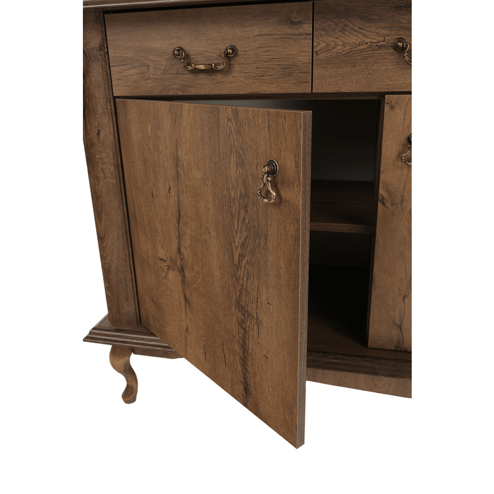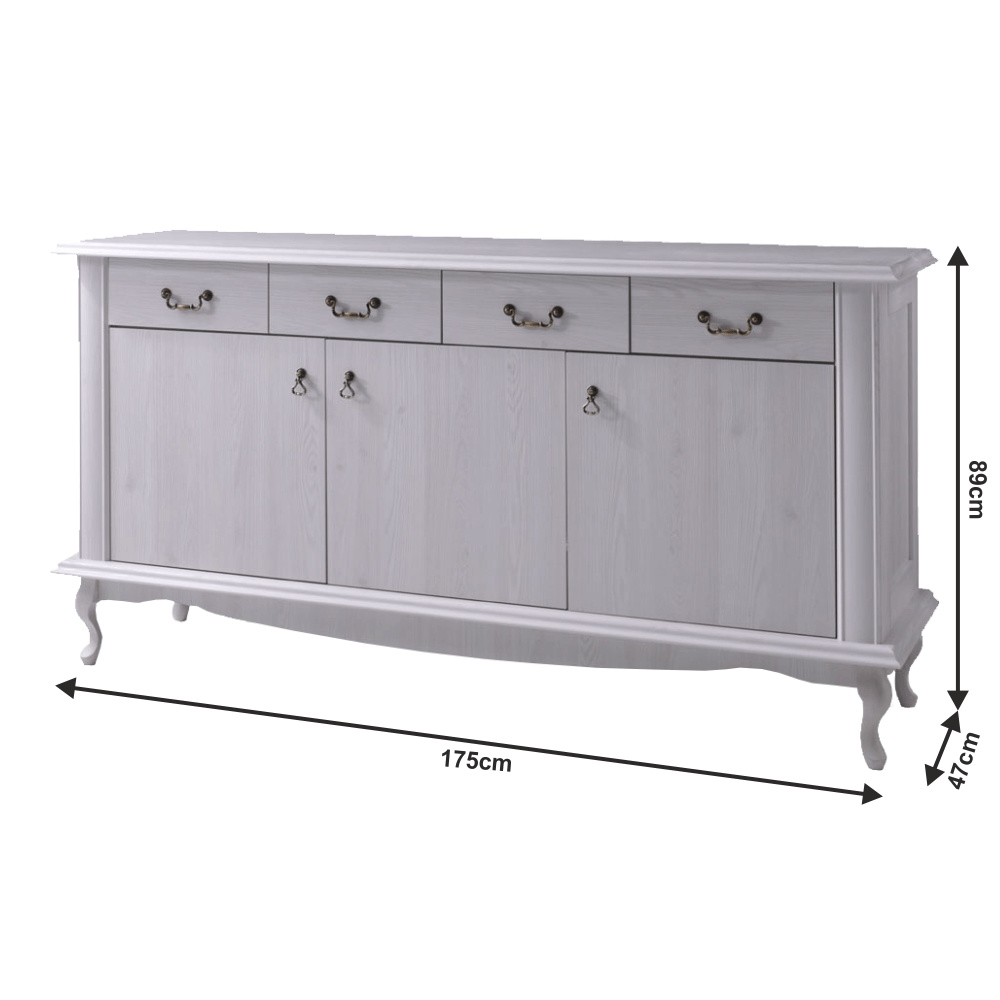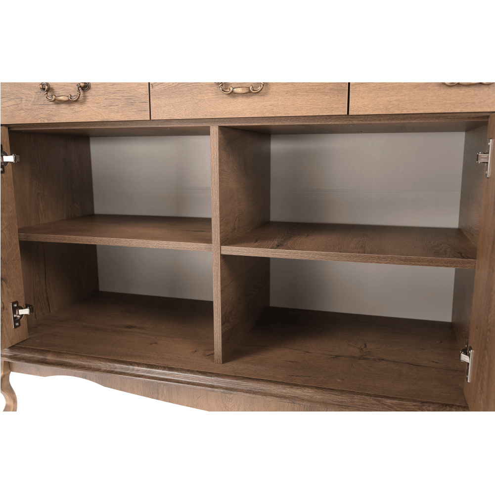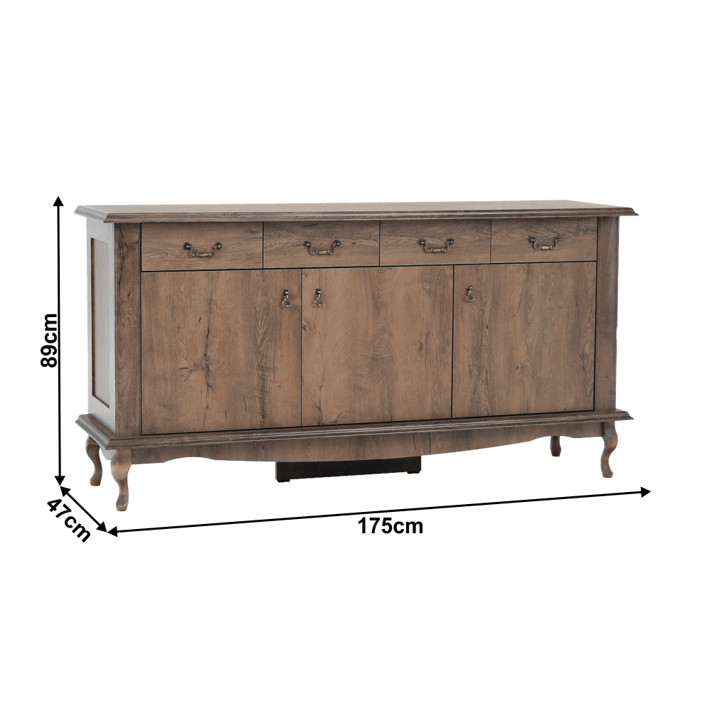 Materiál: DTD laminovaná / ABS hrany Barva: dub lefkas Rozměry (ŠxHxV): 175x47x89 cm Výška spodního prostoru od podlahy: 15 cm Tloušťka materiálu: 30 mm dvě skříňky čtyři šuplíky 3D efekt kovové úchytky Dřevěné nožičky ABS hrany barokní styl