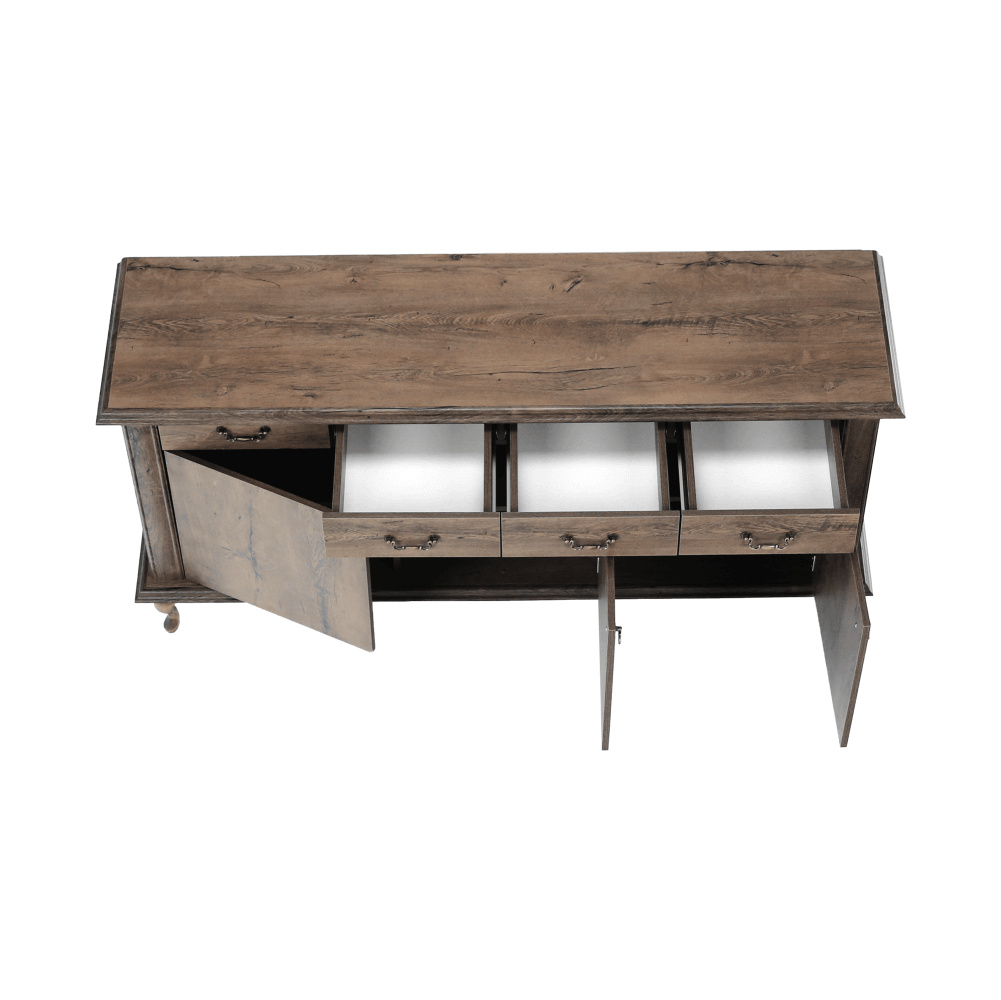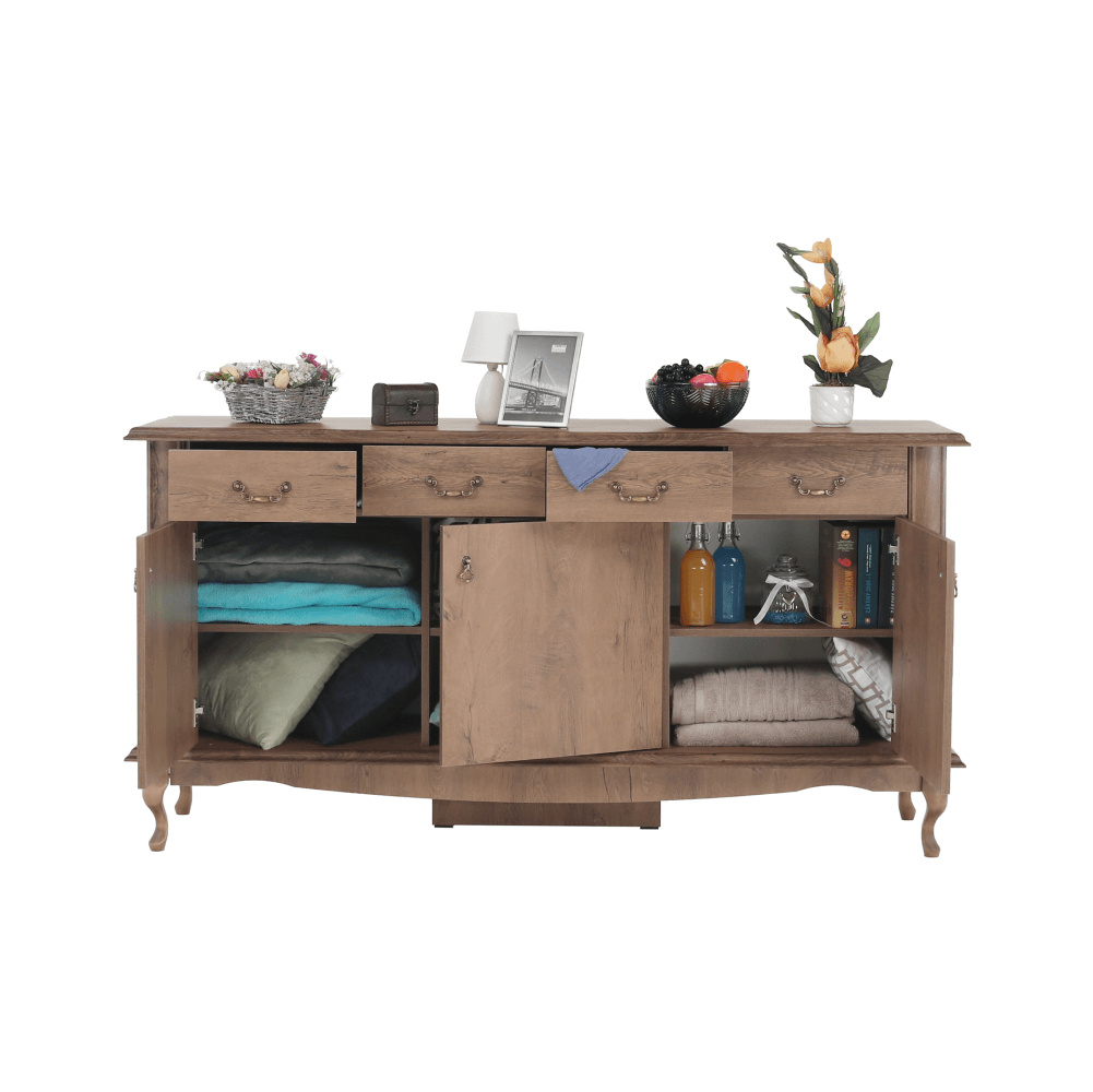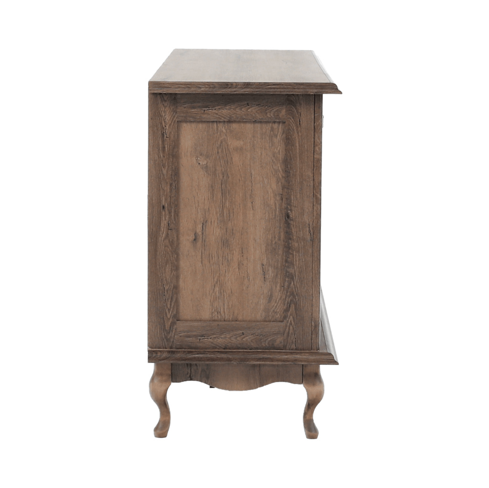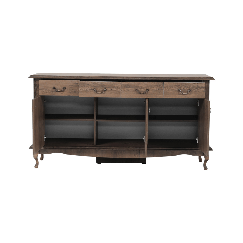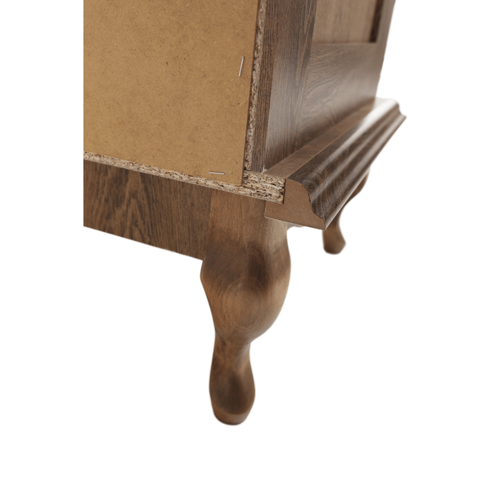 Materiál: DTD laminovaná / ABS hrany Barva: dub lefkas Rozměry (ŠxHxV): 175x47x89 cm Výška spodního prostoru od podlahy: 15 cm Tloušťka materiálu: 30 mm dvě skříňky čtyři šuplíky 3D efekt kovové úchytky Dřevěné nožičky ABS hrany barokní styl