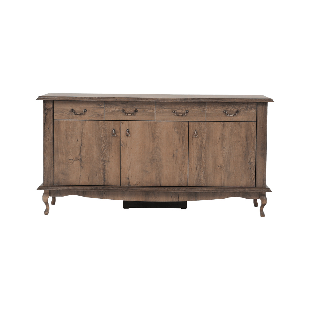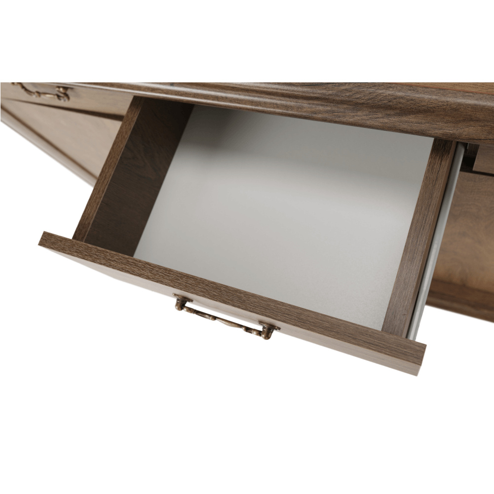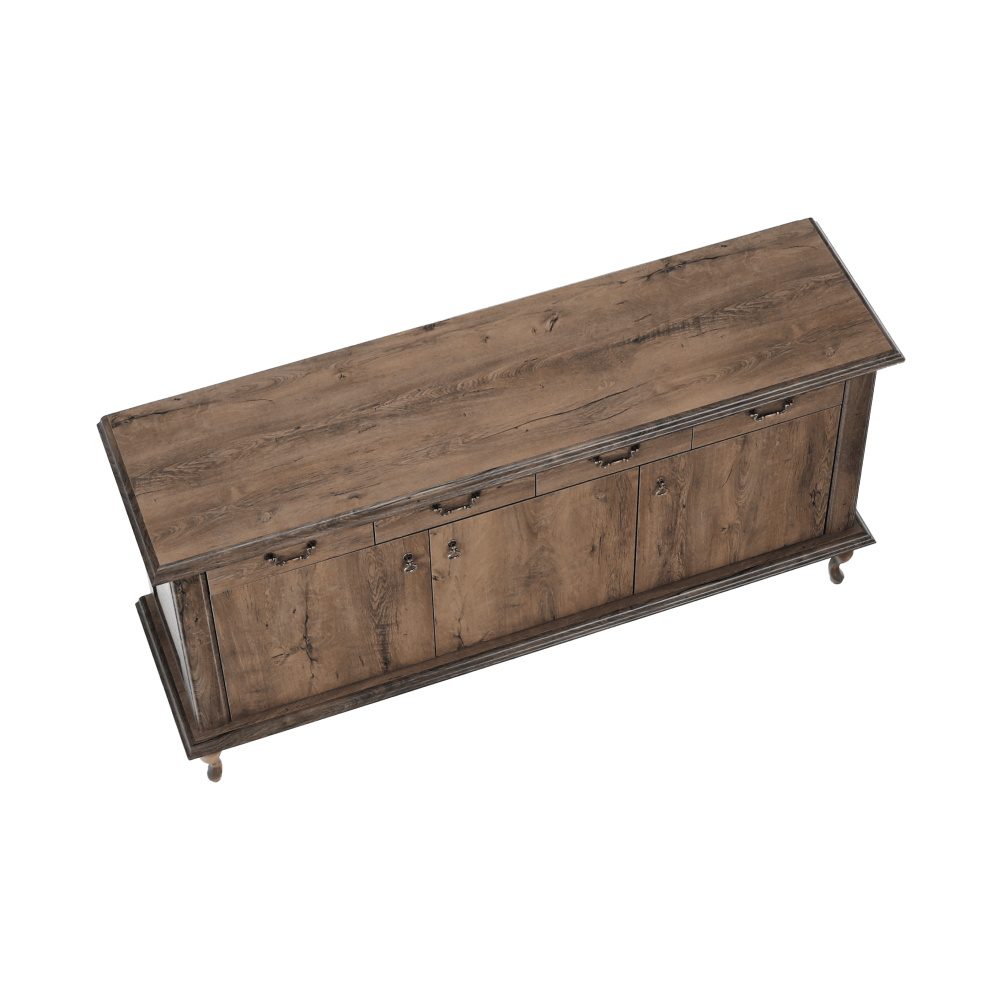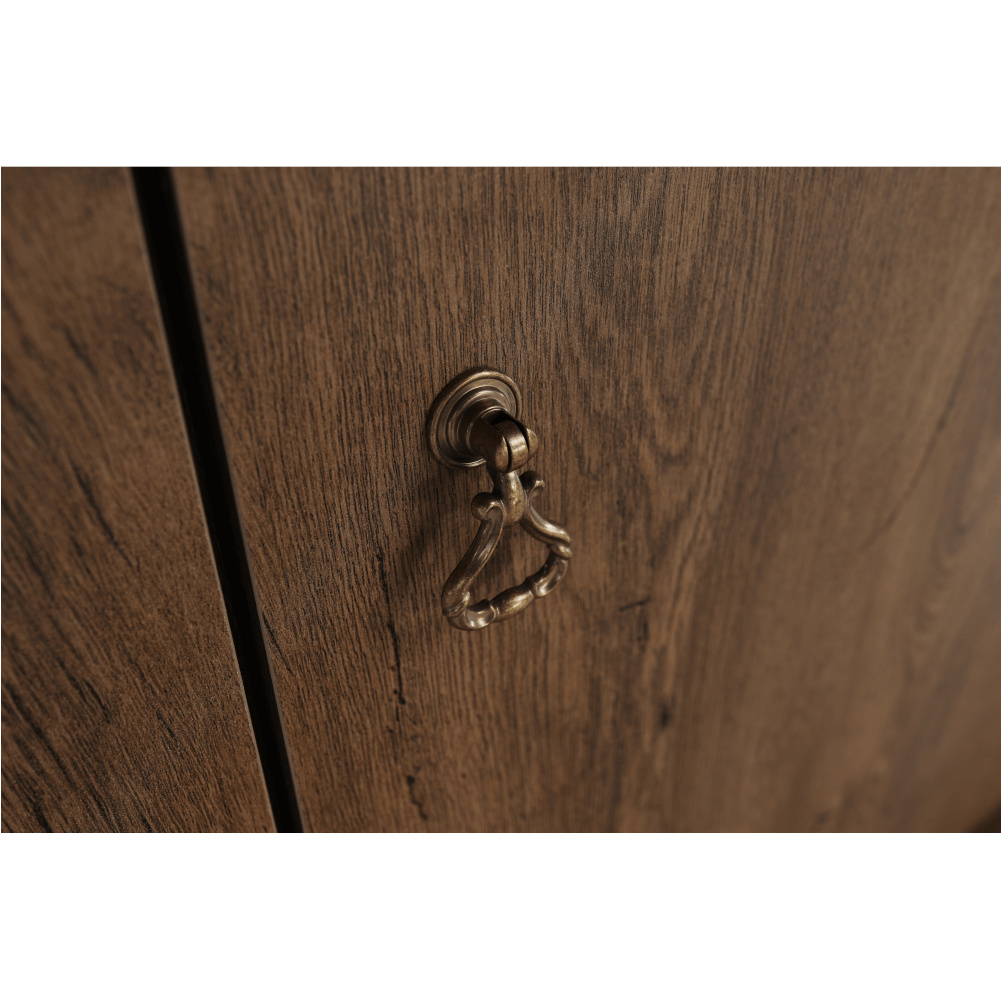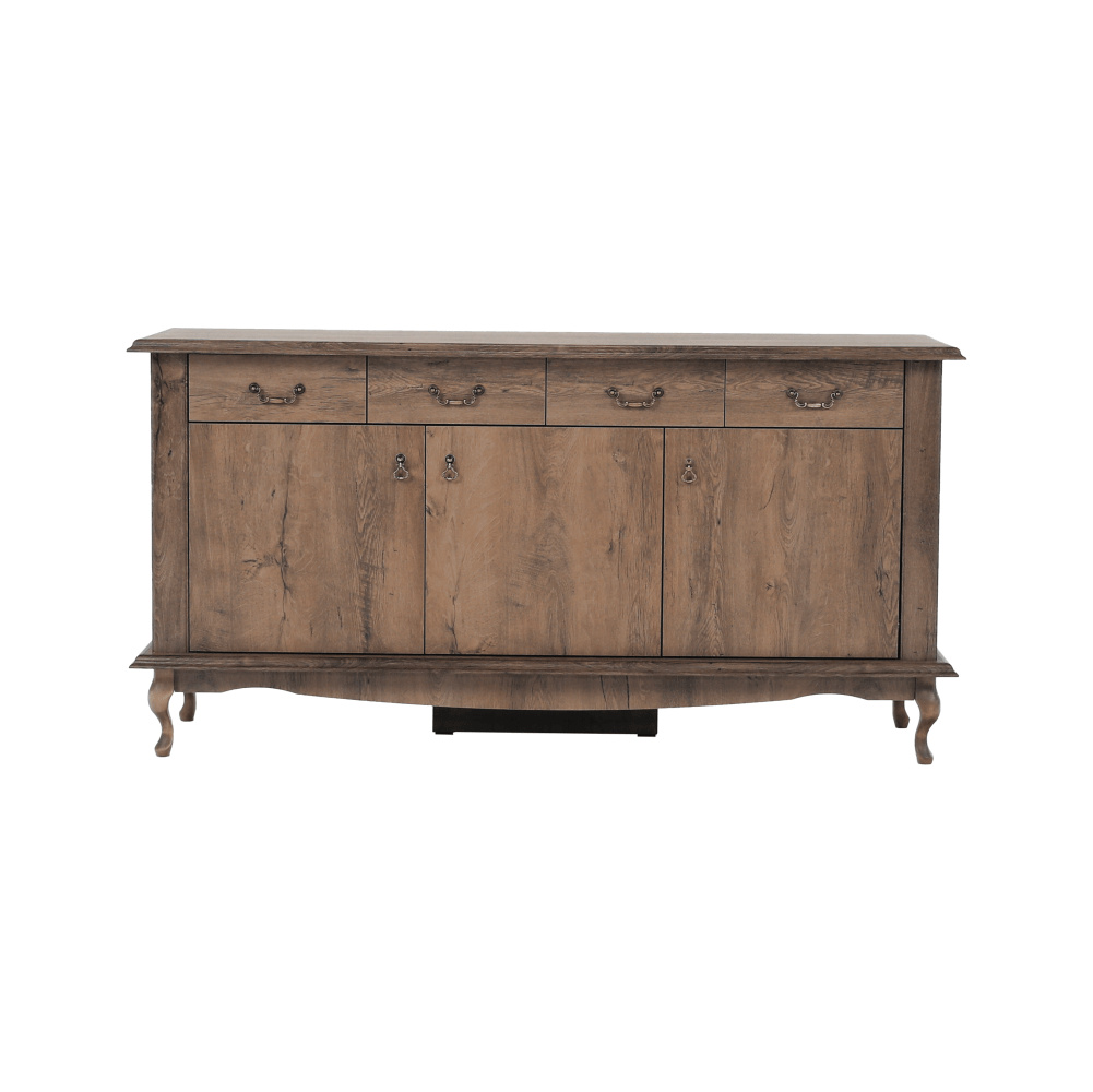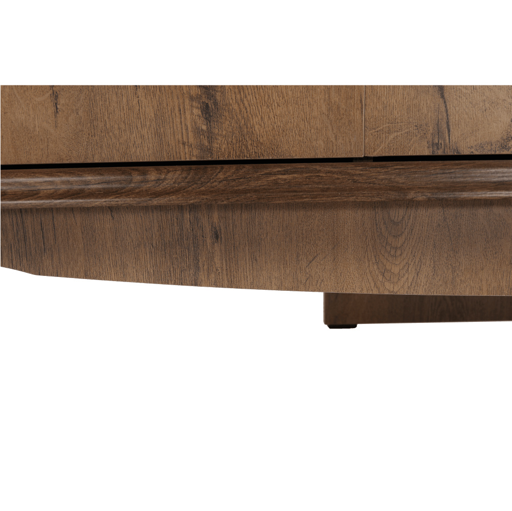 Materiál: DTD laminovaná / ABS hrany Barva: dub lefkas Rozměry (ŠxHxV): 175x47x89 cm Výška spodního prostoru od podlahy: 15 cm Tloušťka materiálu: 30 mm dvě skříňky čtyři šuplíky 3D efekt kovové úchytky Dřevěné nožičky ABS hrany barokní styl