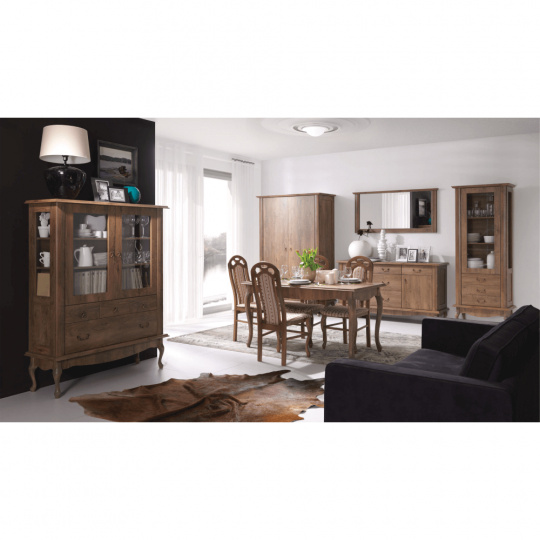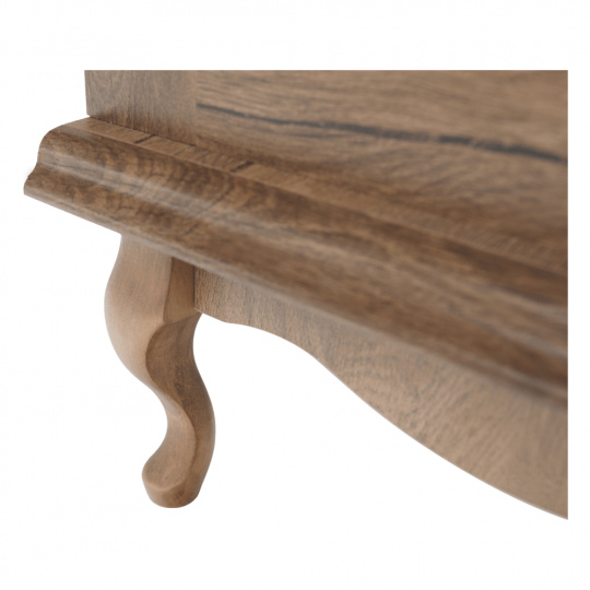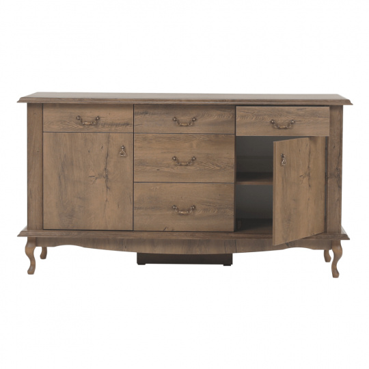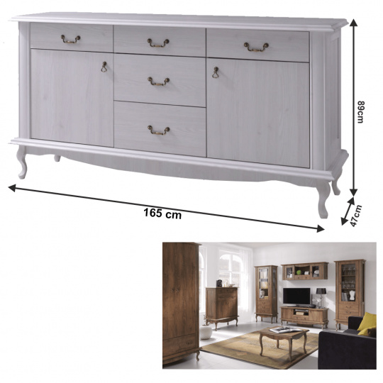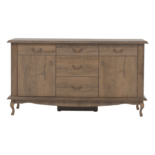 Materiál: DTD laminovaná / ABS hrany Barva: dub lefkas Rozměry (ŠxHxV): 165x47x89 cm Výška spodního prostoru od podlahy: 15 cm Tloušťka materiálu: 30 mm Dvě jednodveřové skříňky Pět šuplíků 3D efekt kovové úchytky Dřevěné nožičky ABS hrany barokní styl