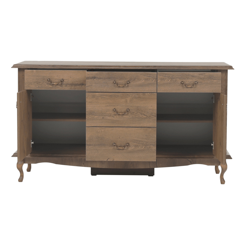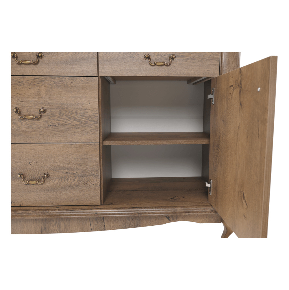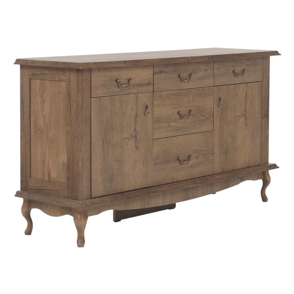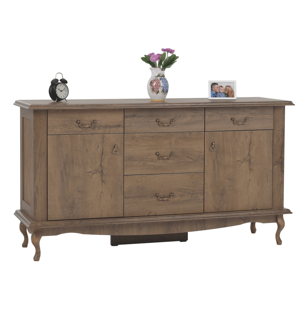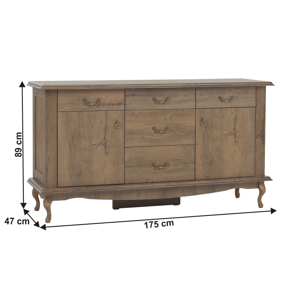 Materiál: DTD laminovaná / ABS hrany Barva: dub lefkas Rozměry (ŠxHxV): 165x47x89 cm Výška spodního prostoru od podlahy: 15 cm Tloušťka materiálu: 30 mm Dvě jednodveřové skříňky Pět šuplíků 3D efekt kovové úchytky Dřevěné nožičky ABS hrany barokní styl