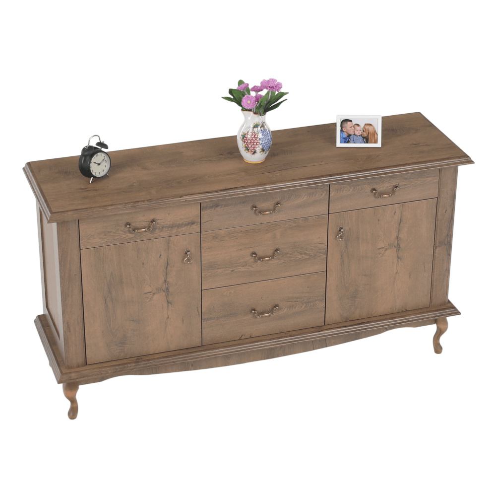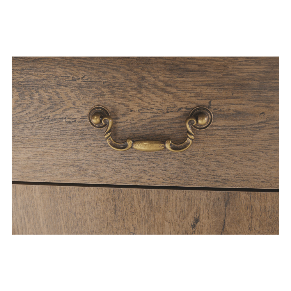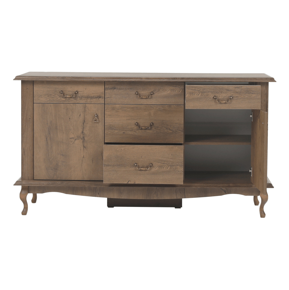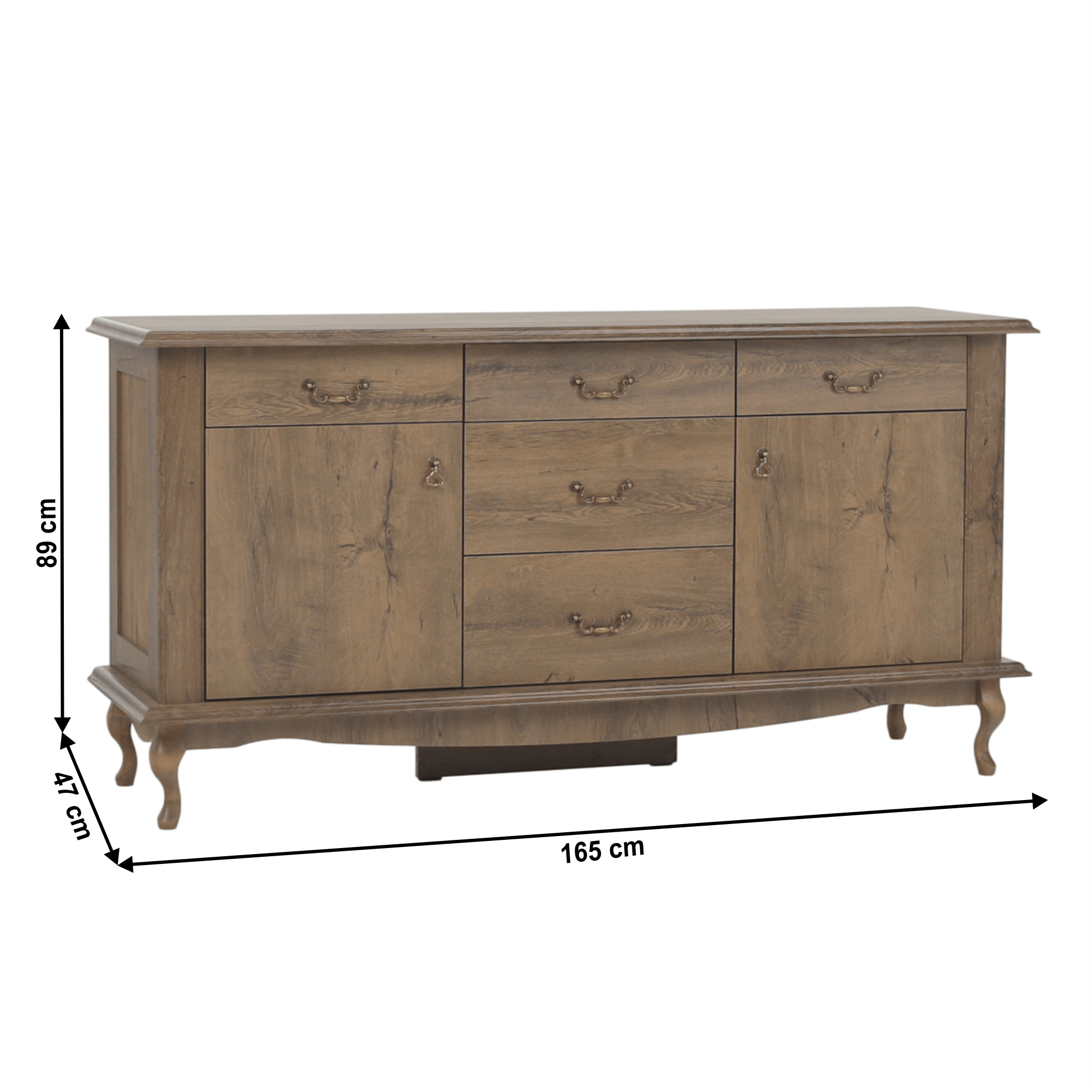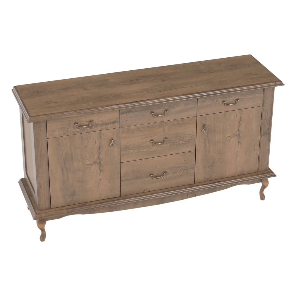 Materiál: DTD laminovaná / ABS hrany Barva: dub lefkas Rozměry (ŠxHxV): 165x47x89 cm Výška spodního prostoru od podlahy: 15 cm Tloušťka materiálu: 30 mm Dvě jednodveřové skříňky Pět šuplíků 3D efekt kovové úchytky Dřevěné nožičky ABS hrany barokní styl