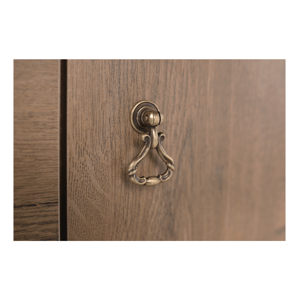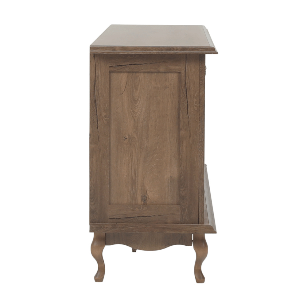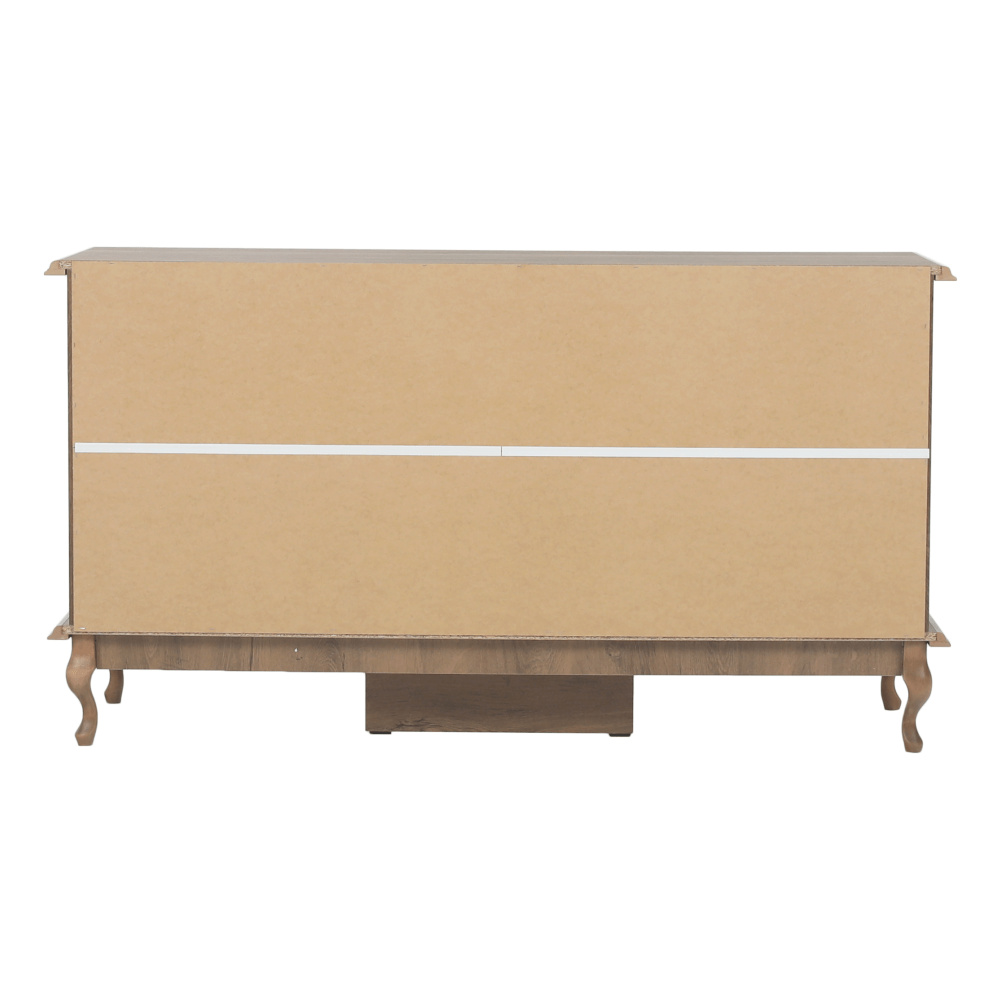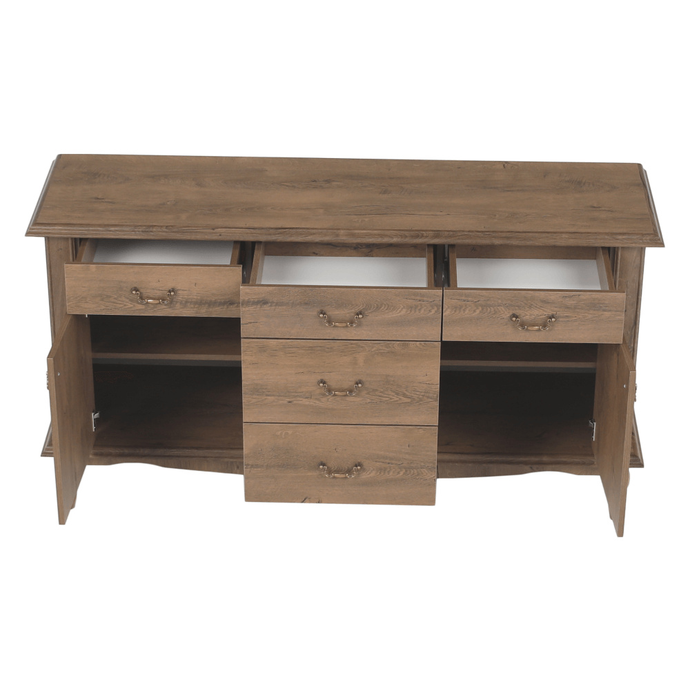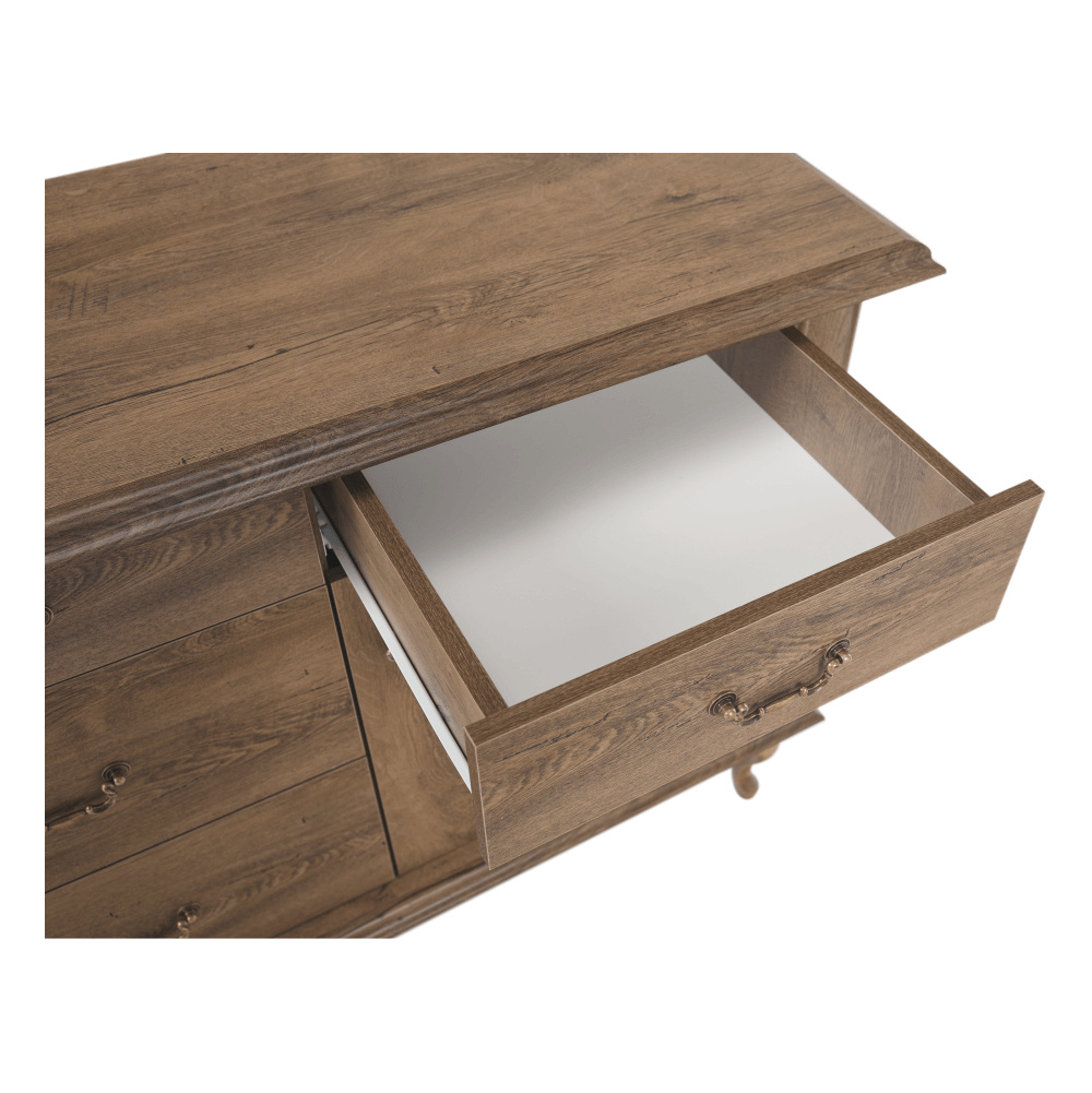 Materiál: DTD laminovaná / ABS hrany Barva: dub lefkas Rozměry (ŠxHxV): 165x47x89 cm Výška spodního prostoru od podlahy: 15 cm Tloušťka materiálu: 30 mm Dvě jednodveřové skříňky Pět šuplíků 3D efekt kovové úchytky Dřevěné nožičky ABS hrany barokní styl