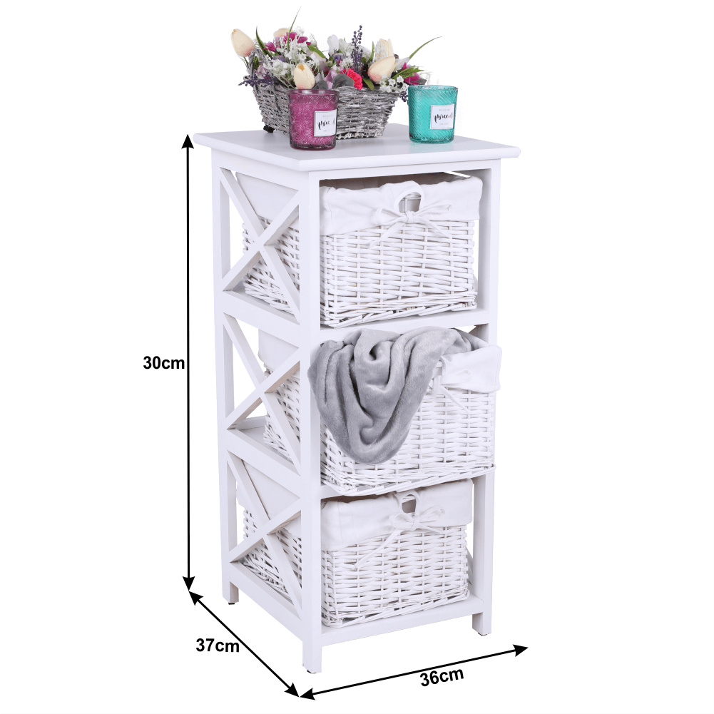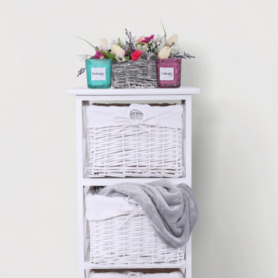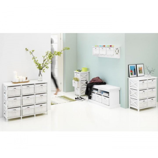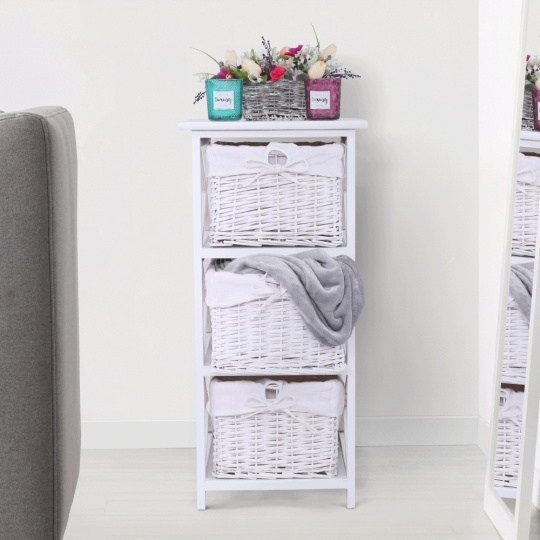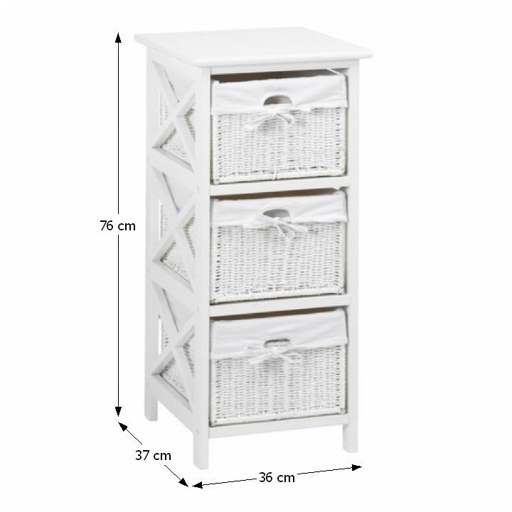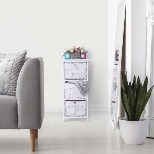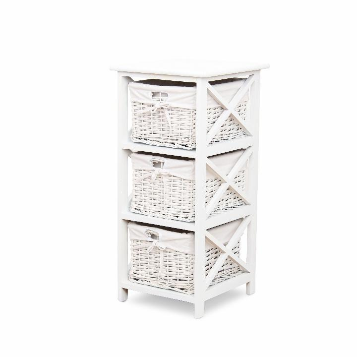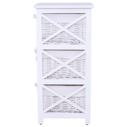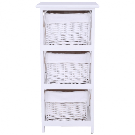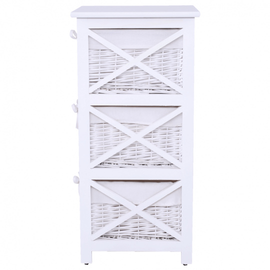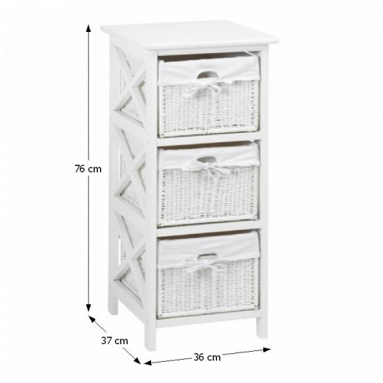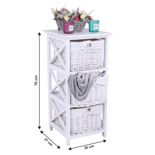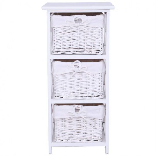 Komoda se třemi košíky Rafaello 3 Materiál: proutí / dřevo / látka Barva: bílá Rozměry (ŠxHxV): 36x37x76 cm Dodávané v monte.