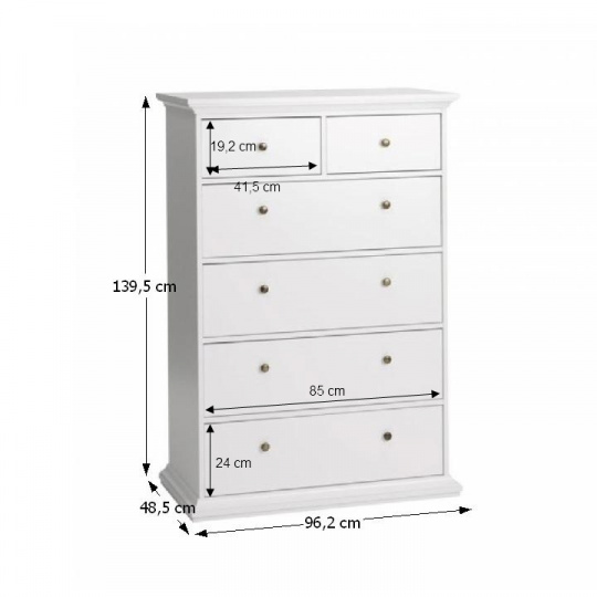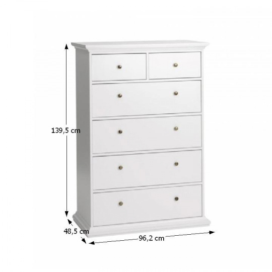 Komoda PARIS 76718 Materiál: DTD laminovaná/lakovaná MDF Barevné provedení: bílá Rozměry (ŠxHxV): 96,2x48,5x139,5 cm Tloušťka materiálu: 18 mm Dodáváno v demontu.