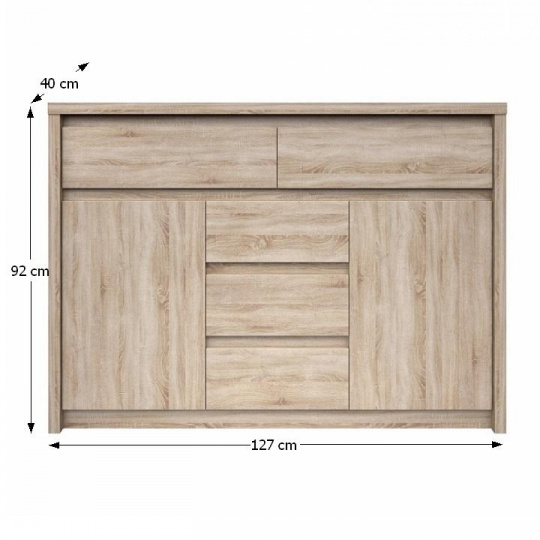 Komoda 2D5S NORTY TYP 10 Materiál: DTD laminovaná Provedení: dub sonoma Rozměry (ŠxHxV): 127x40x92 cm Tloušťka materiálu: 32 mm Tloušťka materiálu zbývající části: 16 mm Dodávané v demontu.