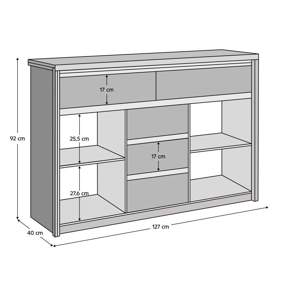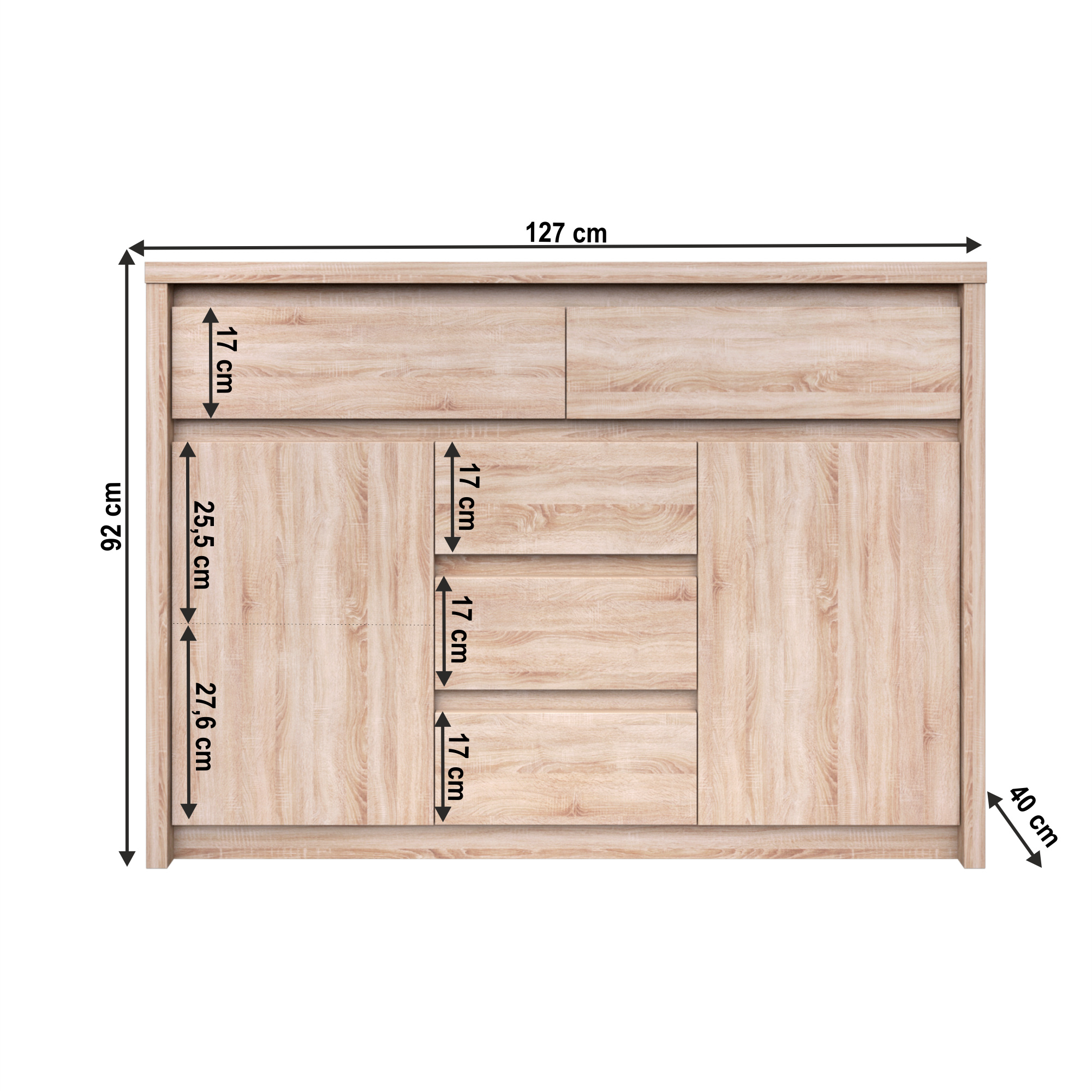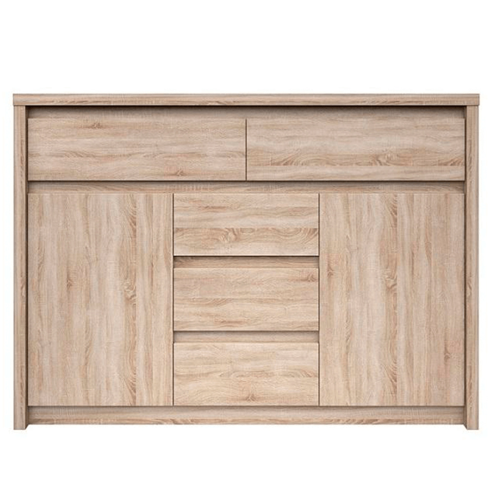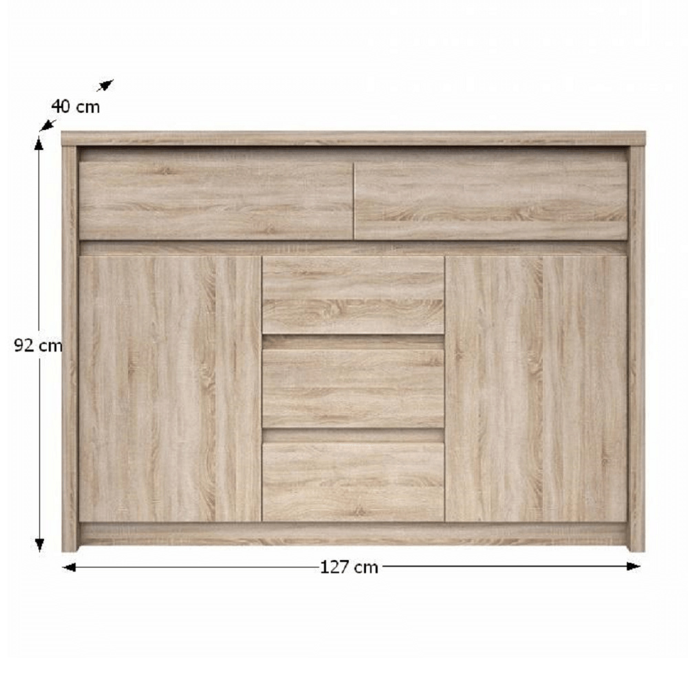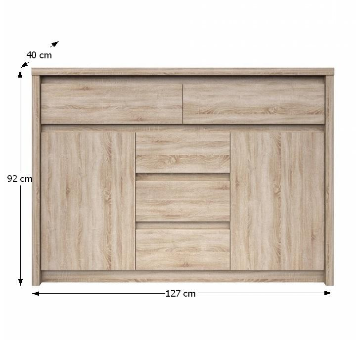 Komoda 2D5S NORTY TYP 10 Materiál: DTD laminovaná Provedení: dub sonoma Rozměry (ŠxHxV): 127x40x92 cm Tloušťka materiálu: 32 mm Tloušťka materiálu zbývající části: 16 mm Dodávané v demontu.