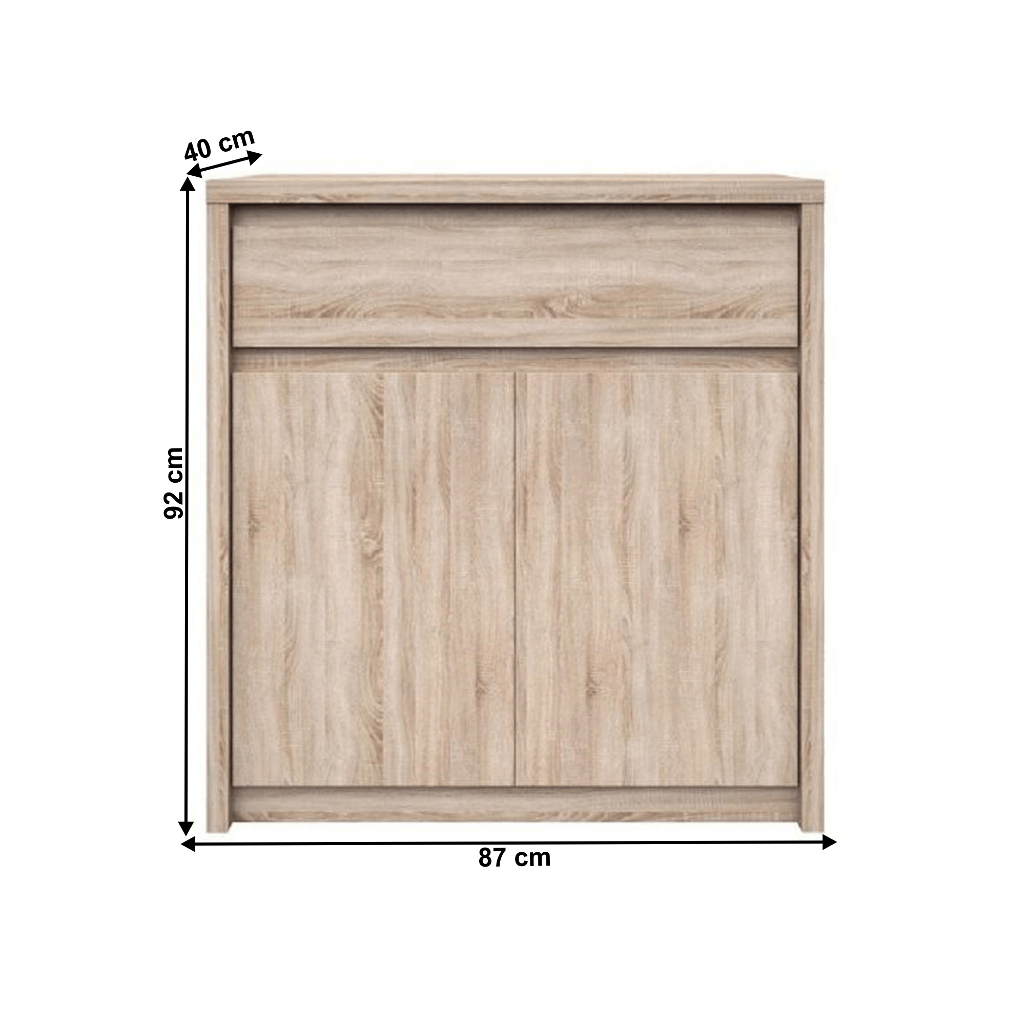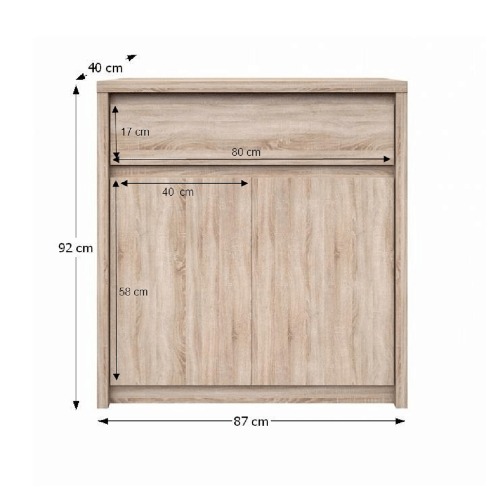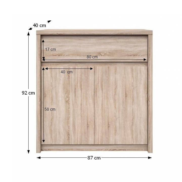 Komoda 2D1S NORTY TYP 9 Materiál: DTD laminovaná Provedení: dub sonoma Rozměry (ŠxHxV): 87x40x92 cm Tloušťka materiálu: 32 mm Tloušťka materiálu zbývající části: 16 mm Dodávané v demontu.