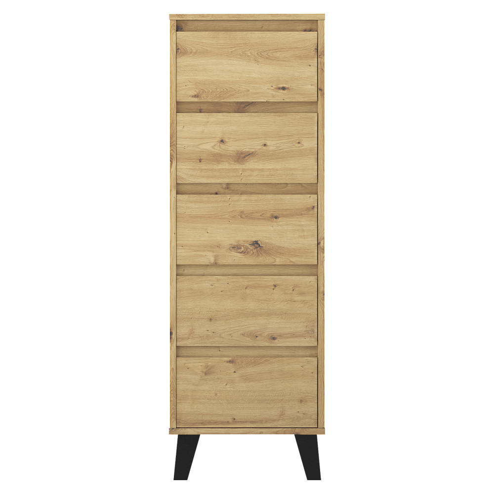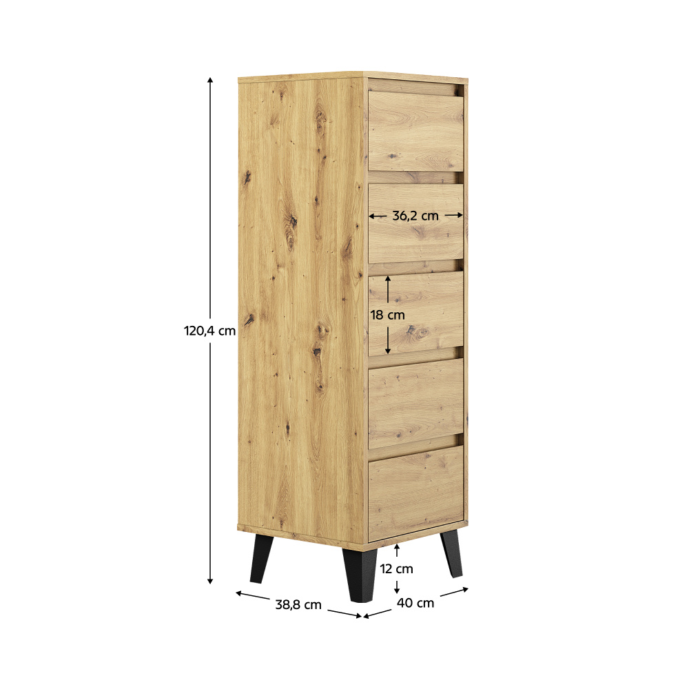 Materiál: laminovaná DTD Barva: dub artisan Rozměry (ŠxHxV): 40x38,8x120,4 cm Výška spodního prostoru od podlahy: 12 cm Pět šuplíků Rozměr šuplíku (ŠxV): 36,2x18 cm Vnitřní rozměr šuplíku (ŠxHxV): 30,8x33,3x9 cm Na nožičkách Barva nožiček: černá Nosnost šuplíku: 5 kg Nosnost vrchní desky: 15 kg Moderní styl Bez úchytek Doporučujeme připevnit ke zdi Dodáváno v demontu