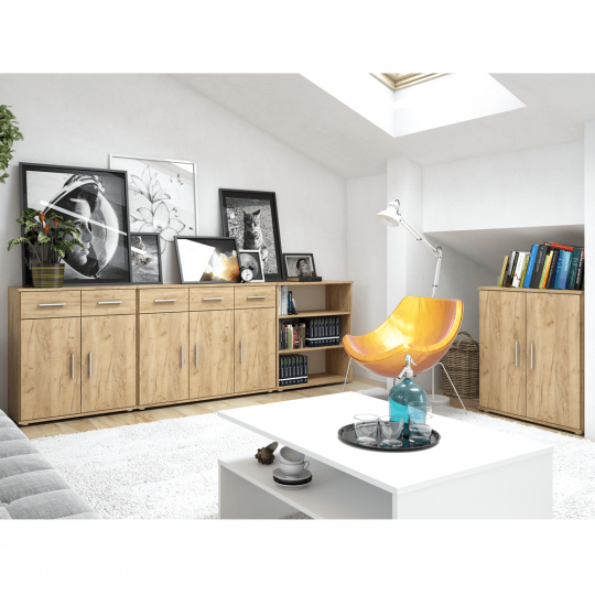 Materiál: DTD laminovaná Barva: dub artisan Rozměry (ŠxHxV): 70,6x35x79,5 cm dvoudveřová policová dvě šuplíky S úchytkami Dodávané v demontu