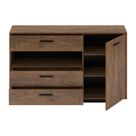 Materiál: DTD laminovaná / MDF fóliovaná Barva: dub bolzano / černá Rozměry (ŠxHxV): 139,3x40x86,2 cm Tloušťka materiálu: 16 mm 1 skříňka Ve skříňce police Otevřený úložný prostor 3 zásuvky na podstavci Výška spodního prostoru od podlahy: 5 cm kovové úchytky originální design Krásná kresba dřeva Do tradičního i moderního interiéru Do obývacího pokoje, pracovny i studentského pokoje Dodávána v demontu