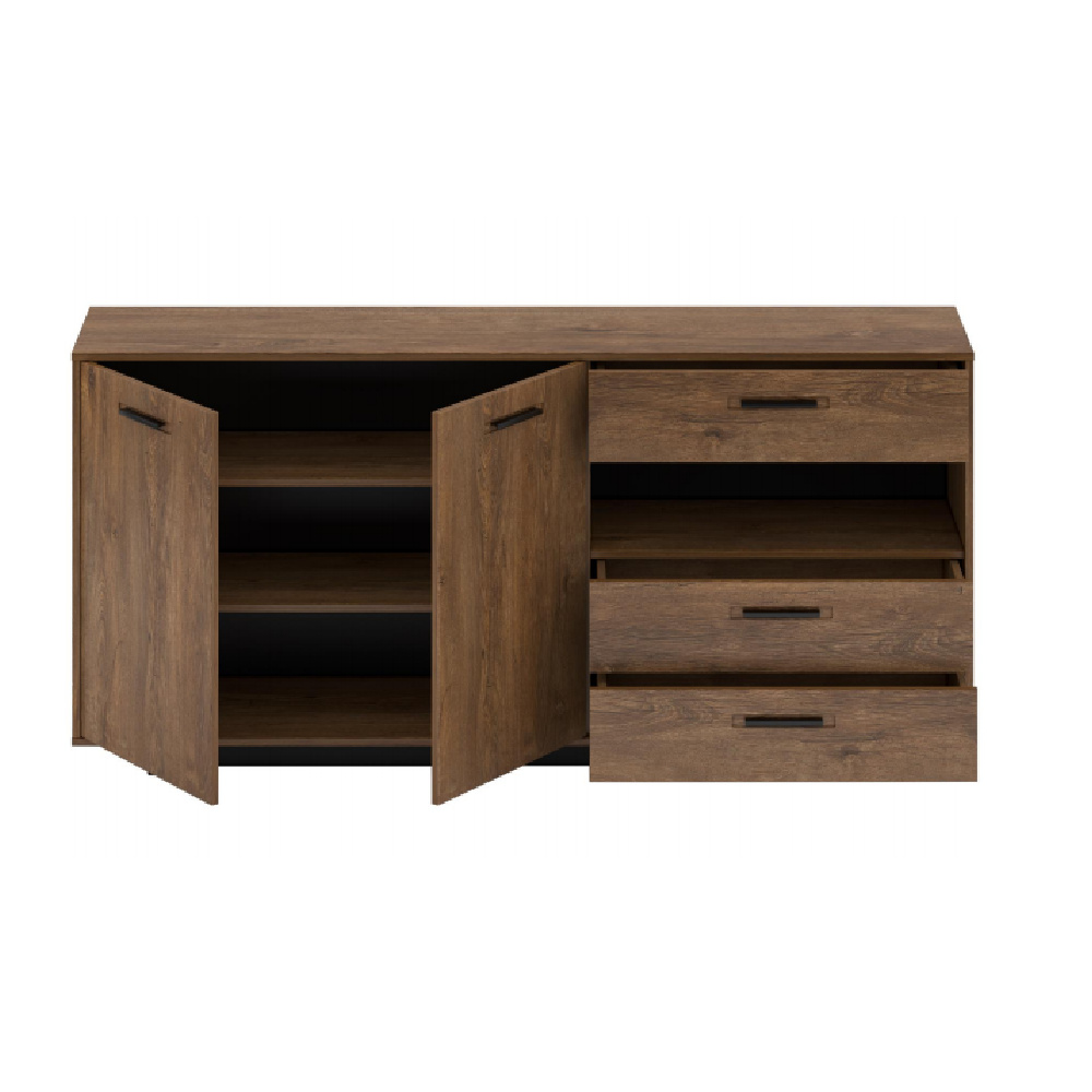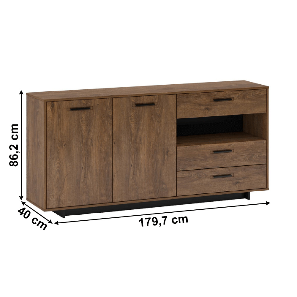 Materiál: DTD laminovaná / MDF fóliovaná Barva: dub bolzano / černá Rozměry (ŠxHxV): 179,7x40x86,2 cm Tloušťka materiálu: 16 mm 1 dvoudveřová skříňka s policemi 3 zásuvky Otevřený úložný prostor na podstavci Výška spodního prostoru od podlahy: 5 cm kovové úchytky originální design Krásná kresba dřeva Do tradičního i moderního interiéru Do obývacího pokoje, pracovny i studentského pokoje Dodávána v demontu