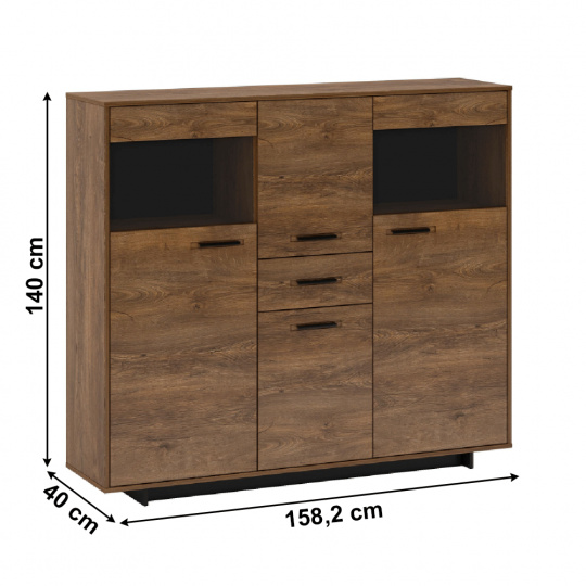 Materiál: DTD laminovaná / MDF fóliovaná/ sklo Barva: dub bolzano / černá Rozměry (ŠxHxV): 158,2x40x140 cm Tloušťka materiálu: 16 mm čtyřdveřová komoda policová 1 zásuvka na podstavci Výška spodního prostoru od podlahy: 5 cm kovová úchytka Bez LED osvětlení Možnost dokoupit LED osvětlení v bílé barvě originální design Krásná kresba dřeva Do tradičního i moderního interiéru Do obývacího pokoje, pracovny i studentského pokoje Dodávána v demontu