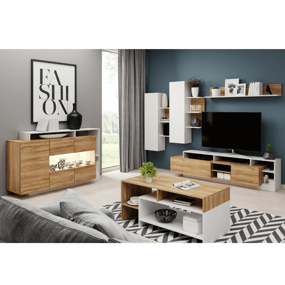 Materiál: DTD laminovaná Barva: dub grandson / bílá Rozměry (ŠxHxV): 155x30-44x93,5 cm Tloušťka materiálu: 16 mm Množství úložného prostoru dvě skříňky Čast dvířek skelná S policemi Otevřený úložný prostor Ke komodě doporučujeme dokoupit LED osvětlení (bílé podbarvení) z naší nabídky Dodávané v demontu