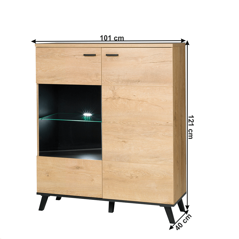 Materiál: DTD laminovaná / plast Barva: dub lefkas / černá Rozměry (ŠxHxV): 101x40x121 cm Výška spodního prostoru od podlahy: 12 cm dvoudveřová komoda ABS hrany plastové nožičky moderní styl Dodávané bez LED osvětlení Možnost dokoupit LED osvětlení Dodávané v demontu