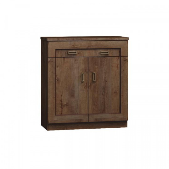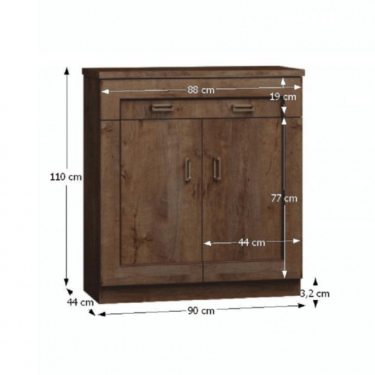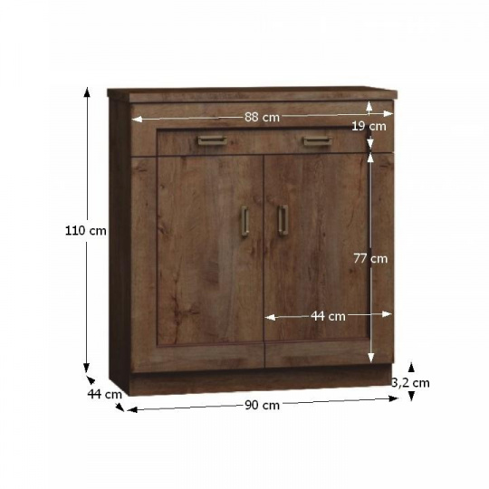 Komoda TEDY TYP T2 Materiál: laminovaná DTD/fóliovaná MDF/kov/sklo Barva: dub lefkas Rozměry (ŠxHxV): 90x44x110 cm Tloušťka materiálu: 32 mm Tloušťka materiálu zbývající části: 16 mm ABS hrany Rustikální styl Ozdobné lišty Kovové úchytky Jeden šuplík Dvoudveřová Dodáváno v demontu