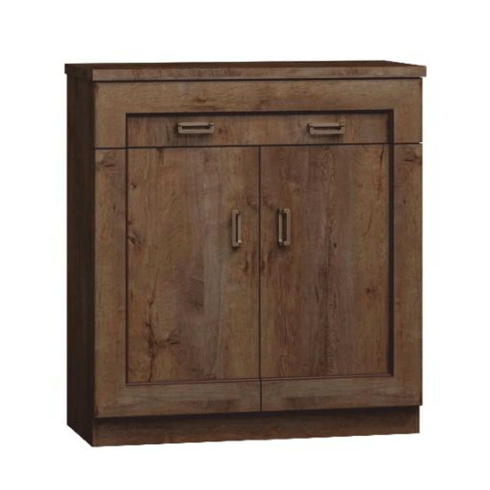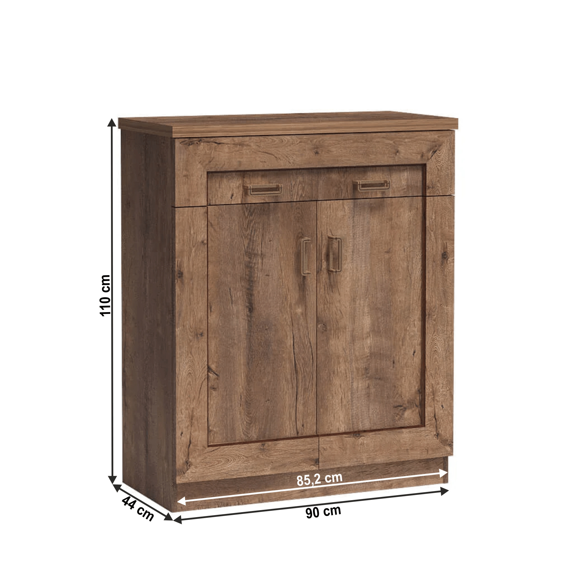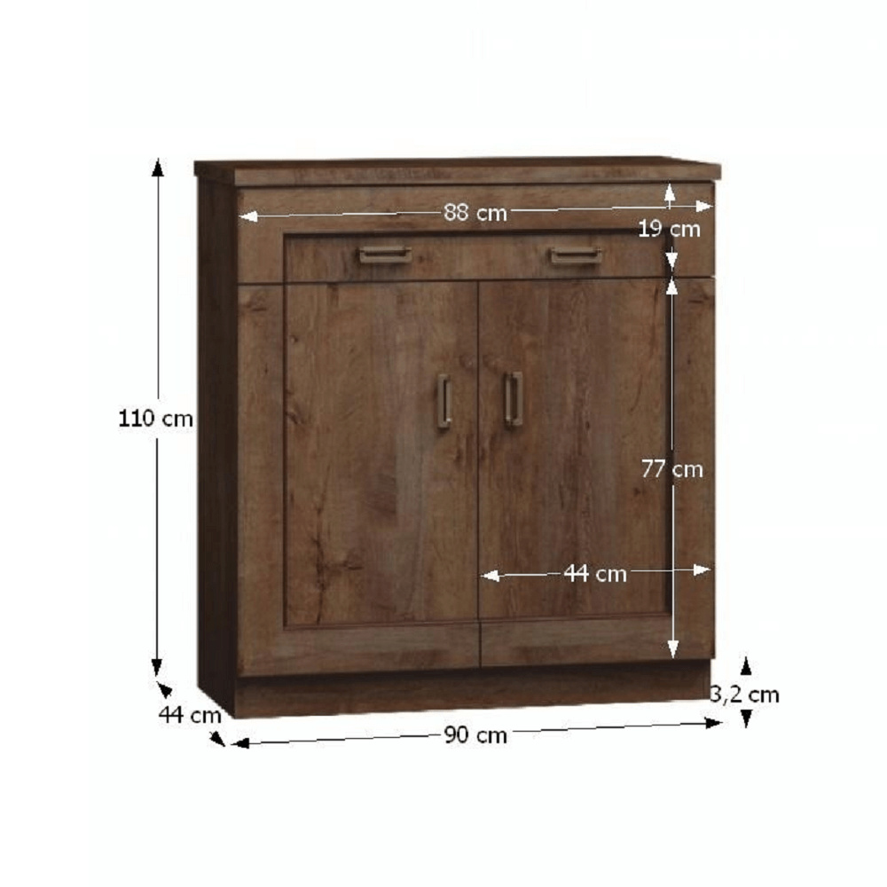Komoda TEDY TYP T2 Materiál: laminovaná DTD/fóliovaná MDF/kov/sklo Barva: dub lefkas Rozměry (ŠxHxV): 90x44x110 cm Tloušťka materiálu: 32 mm Tloušťka materiálu zbývající části: 16 mm ABS hrany Rustikální styl Ozdobné lišty Kovové úchytky Jeden šuplík Dvoudveřová Dodáváno v demontu