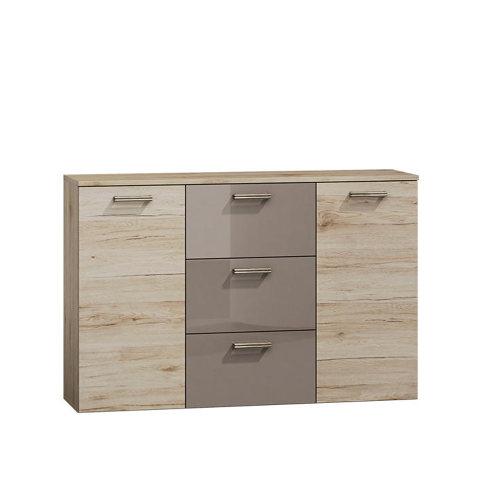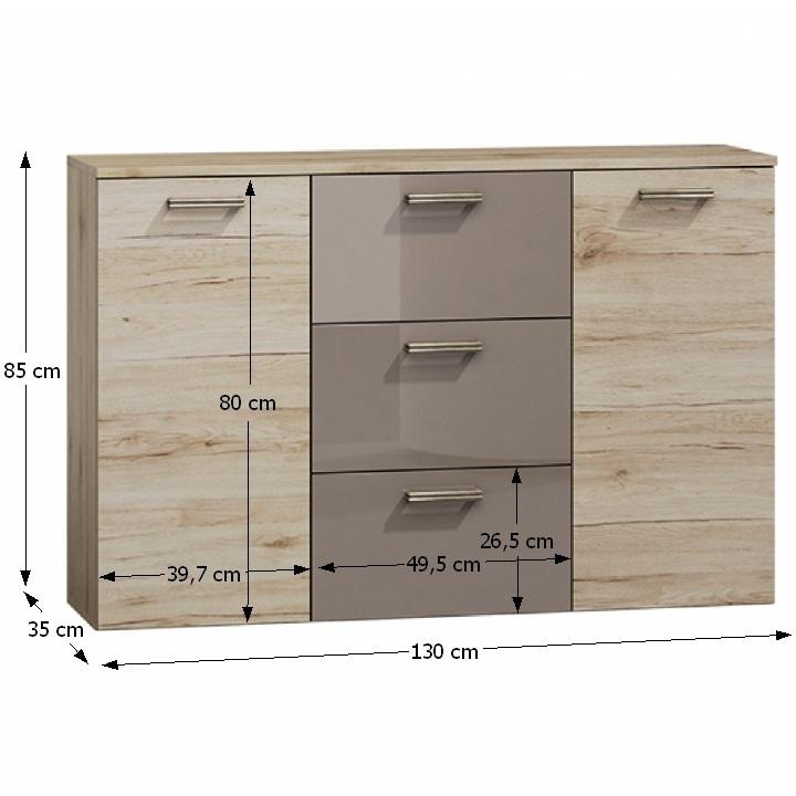 Komoda ASSOR Materiál: DTD laminovaná Barva: dub san marino / latte vysoký lesk HG Rozměry (ŠxHxV): 130x35x85 cm Tloušťka materiálu: 16 mm Dodávané v demontu.