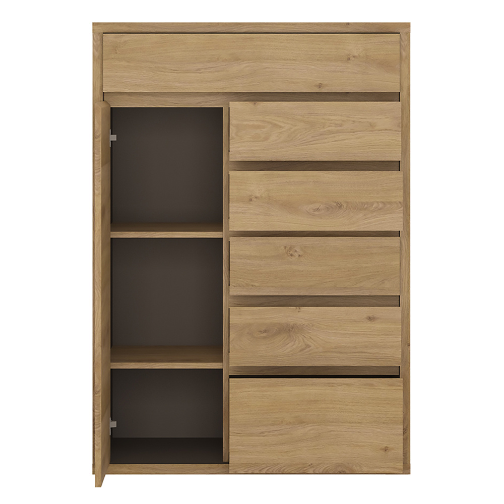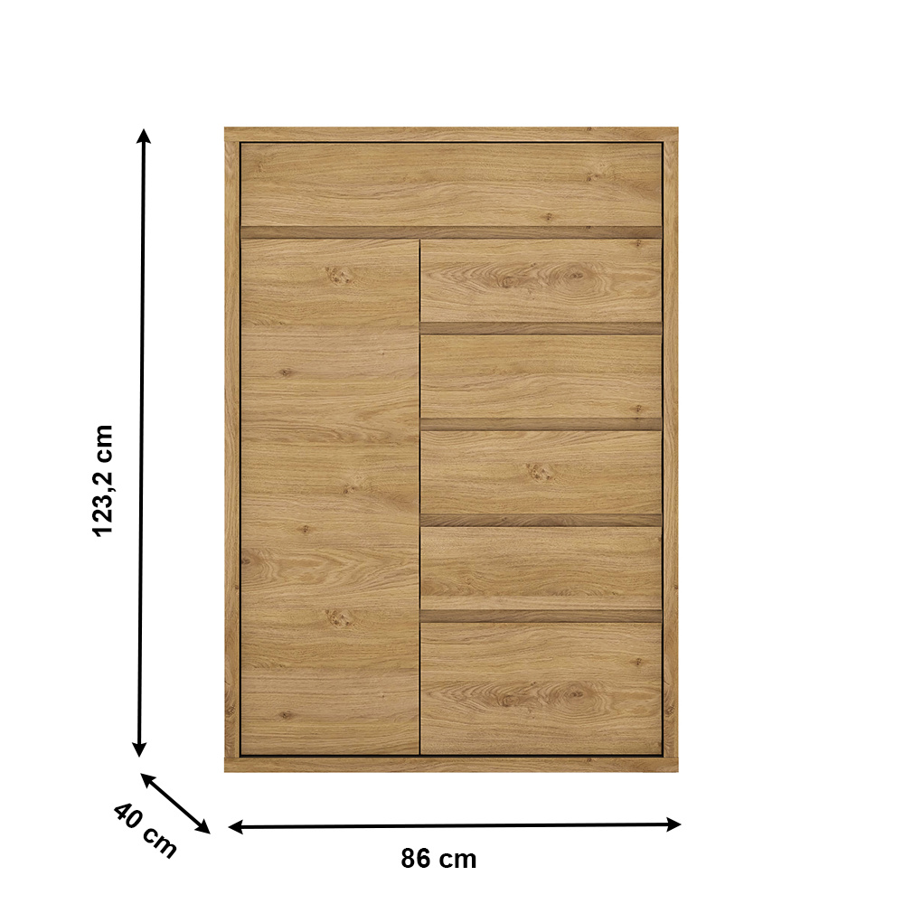 Materiál: laminovaná DTD Barevné provedení: dub Shetland/šedá Rozměry (ŠxHxV): 86x40x123,2 cm Tloušťka korpusu: 2,8 cm bez úchytová Jednoduchá a elegantní hrubý korpus 6 šuplíků 2 poličky moderní styl vysoká kvalita precizní zpracování Odolná vůči poškrábání, UV záření, vysokým teplotám Nosnost poličky: 5 kg Nosnost šuplíku: 5 kg Dodávané v demontu