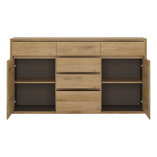 Materiál: laminovaná DTD Barevné provedení: dub Shetland/šedá Rozměry (ŠxHxV): 156x40x86,8 cm Tloušťka korpusu: 2,8 cm bez úchytová Jednoduchá a elegantní hrubý korpus 6 šuplíků 2 poličky 2 jednodveřové skříňky moderní styl vysoká kvalita precizní zpracování Odolná vůči poškrábání, UV záření, vysokým teplotám Nosnost poličky: 5 kg Nosnost šuplíku: 5 kg Dodávané v demontu