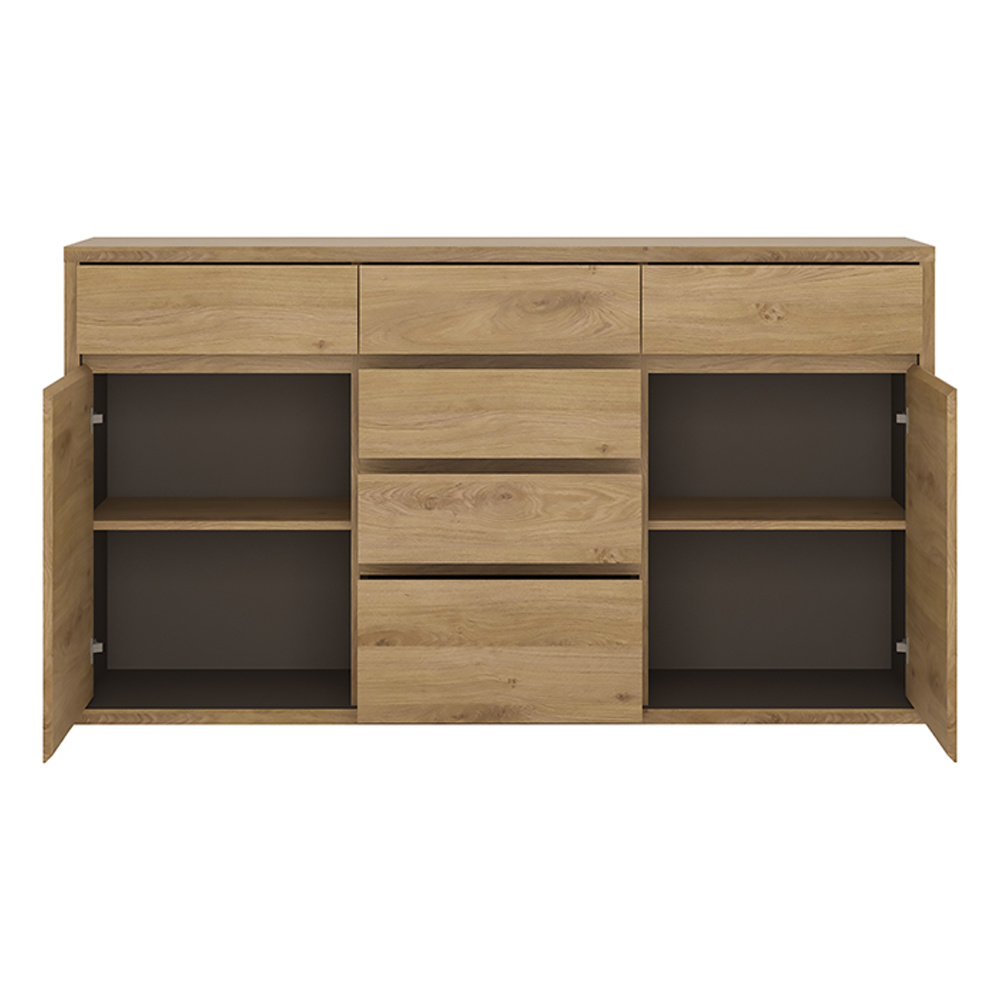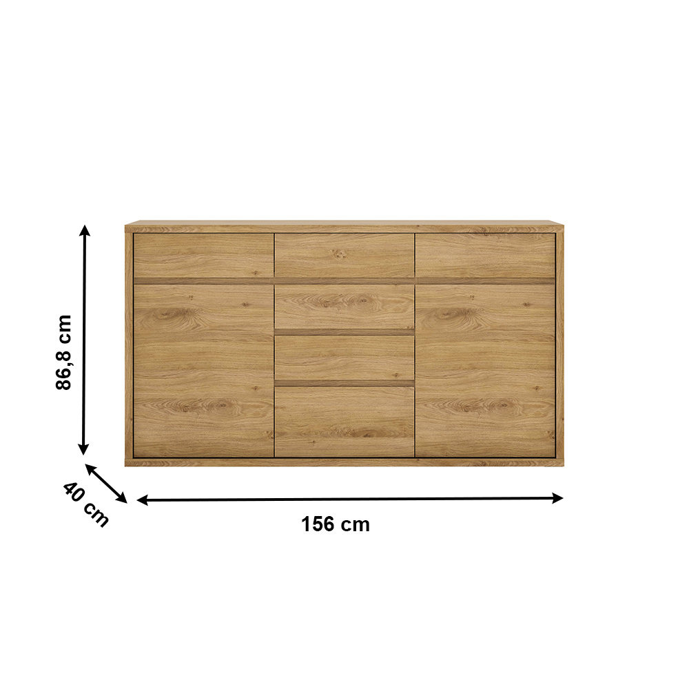 Materiál: laminovaná DTD Barevné provedení: dub Shetland/šedá Rozměry (ŠxHxV): 156x40x86,8 cm Tloušťka korpusu: 2,8 cm bez úchytová Jednoduchá a elegantní hrubý korpus 6 šuplíků 2 poličky 2 jednodveřové skříňky moderní styl vysoká kvalita precizní zpracování Odolná vůči poškrábání, UV záření, vysokým teplotám Nosnost poličky: 5 kg Nosnost šuplíku: 5 kg Dodávané v demontu