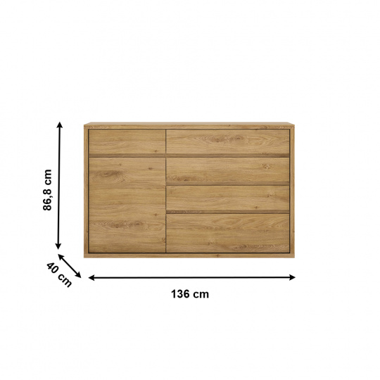 Materiál: laminovaná DTD Barevné provedení: dub Shetland/šedá Rozměry (ŠxHxV): 136x40x86,8 cm Tloušťka korpusu: 2,8 cm bez úchytová Jednoduchá a elegantní hrubý korpus 5 šuplíků 1 poličky 1 jednodveřová skříňka moderní styl vysoká kvalita precizní zpracování Odolná vůči poškrábání, UV záření, vysokým teplotám Nosnost poličky: 5 kg Nosnost šuplíku: 5 kg Dodávané v demontu