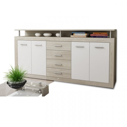 Komoda JACHIM - JUNO NEW , materiál: DTD laminovaná, Barevné provedení: dub sonoma / bílá, Rozměr (ŠxHxV): 195x37x96,5 cm Tloušťka materiálu: 16 mm Dodávána v demontu.