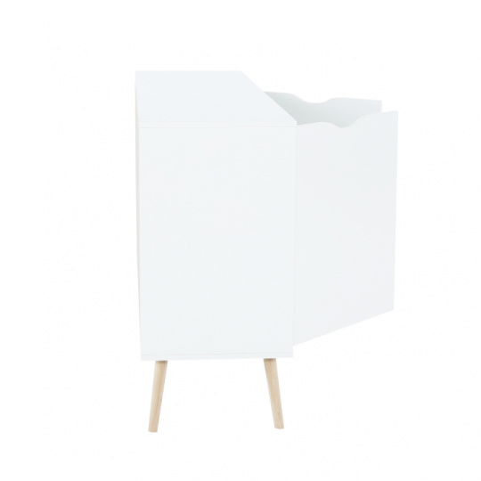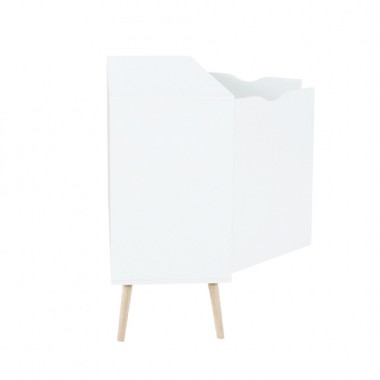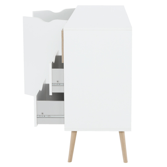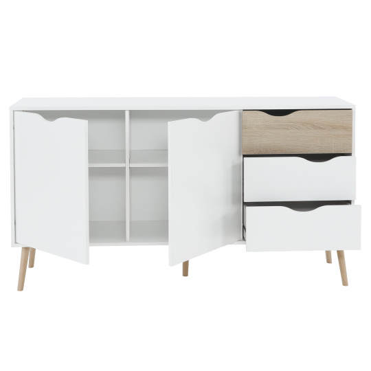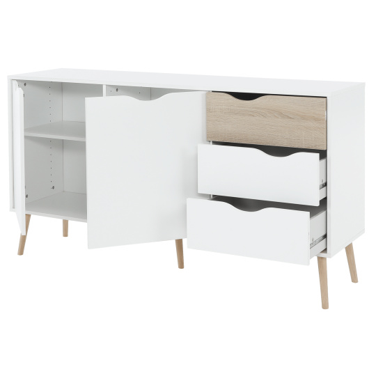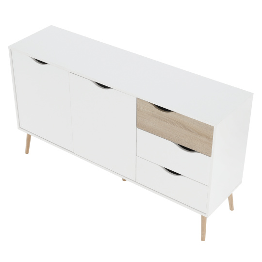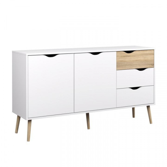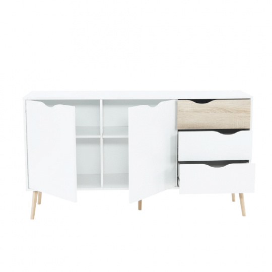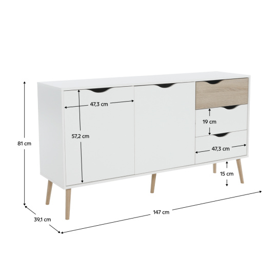Komoda 75381 Materiál: DTD laminovaná Provedení: dub sonoma / bílá Rozměry (ŠxHxV): 147,1x39,1x81 cm dvoje dvířek 4 poličky 3 šuplíky Tloušťka materiálu: 1,6 cm Výška nohou: 15 cm Dodávané v demontu