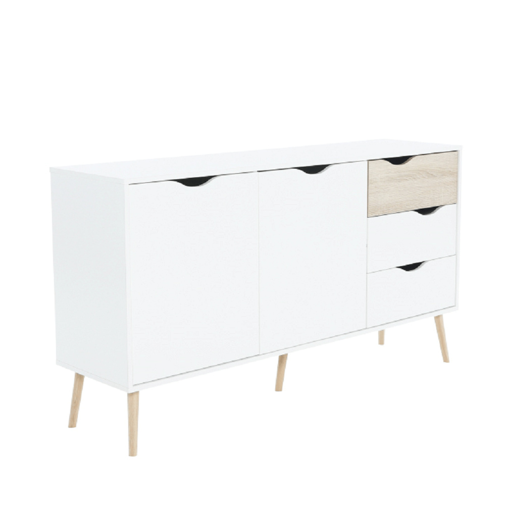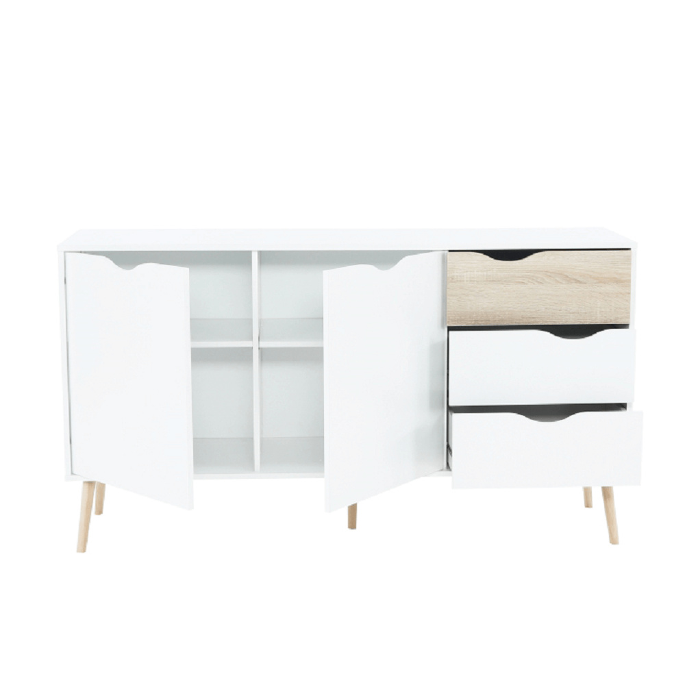 Komoda 75381 Materiál: DTD laminovaná Provedení: dub sonoma / bílá Rozměry (ŠxHxV): 147,1x39,1x81 cm dvoje dvířek 4 poličky 3 šuplíky Tloušťka materiálu: 1,6 cm Výška nohou: 15 cm Dodávané v demontu