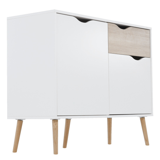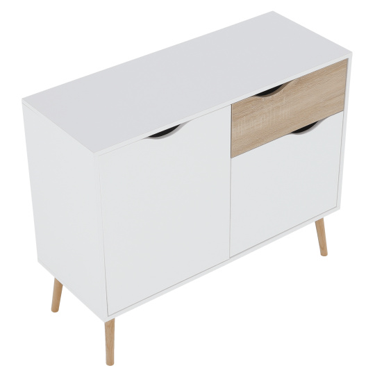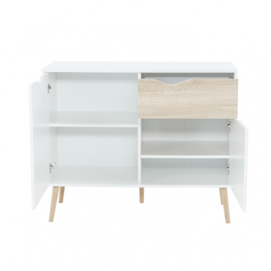 komoda 75387 Materiál: DTD laminovaná Provedení: dub sonoma / bílá Rozměry (ŠxHxV): 98,1x39,1x81 cm dvoje dvířek čtyři poličky šuplík Tloušťka materiálu: 1,6 cm Výška nohou: 15 cm Dodávané v demontu