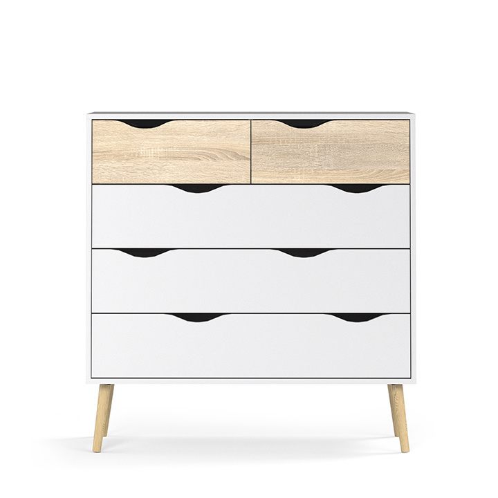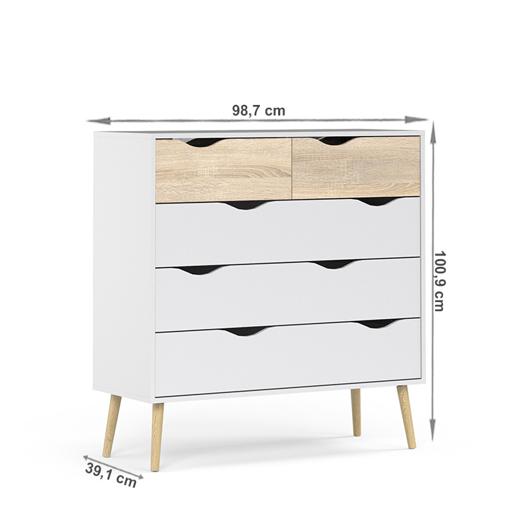 Materiál: DTD laminovaná Barva: bílá / dub sonoma Rozměry komody (ŠxHxV): 98,7x39,1x100,9 cm Tloušťka materiálu: 1,6 cm Dodávané v demontu