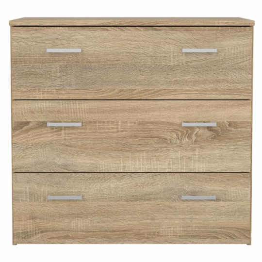 Komoda GARBO 3 Materiál: DTD laminovaná Provedení: dub sonoma Rozměry komody (ŠxHxV): 74,1x36x69,9 cm Rozměry šuplíku (ŠxV): 71x22 cm Tloušťka materiálu korpus: 12 mm Tloušťka materiálu vrchní plát: 15 mm 3 šuplíky Dodávané v demontu