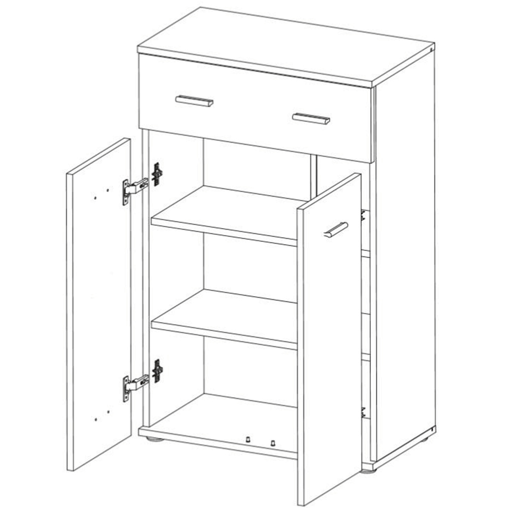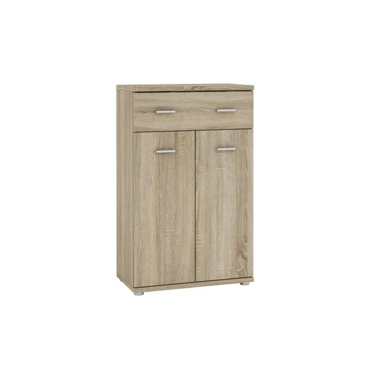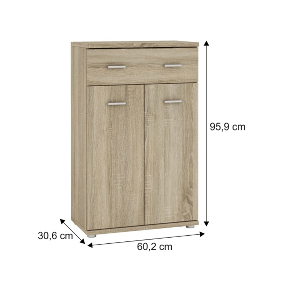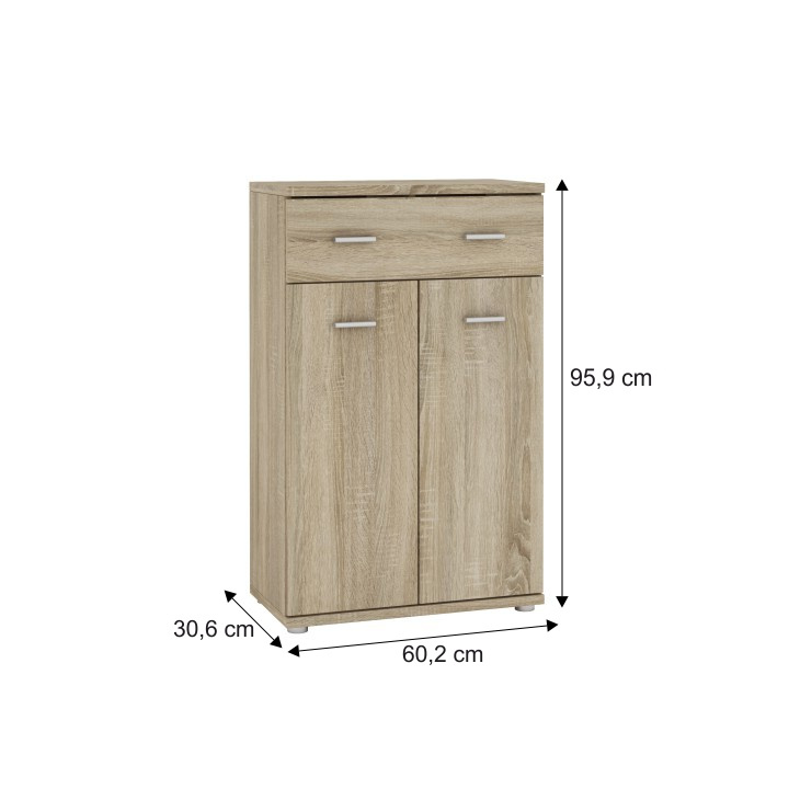 Komoda Mario New Typ G, komponent z předsíňové sestavy, Materiál DTD laminovaná, Barevné provedení: dub sonoma. Rozměry: (ŠxVxH): 60,2x95,9x30,6 cm. Tloušťka materiálu: 16/22 mm Dvířka mají hladké zakončení.