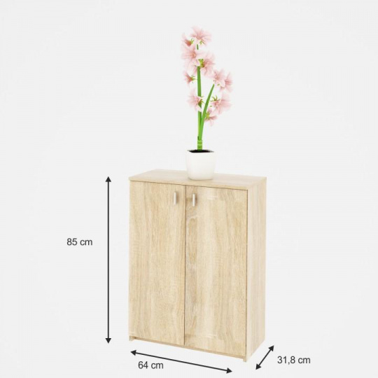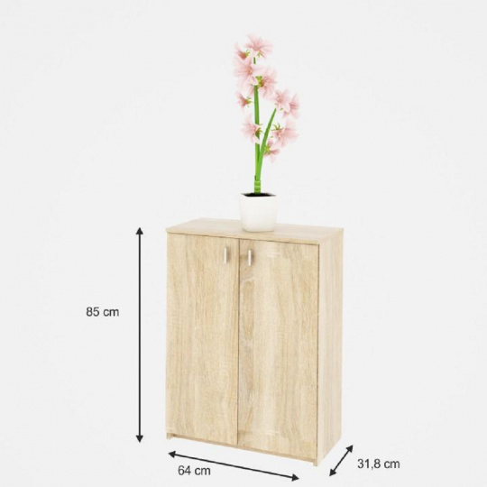 Dvoudveřová komoda NATALI TYP4 Barva: dub sonoma Materiál: DTD laminovaná Rozměry (ŠxHxV): 64x31,8x85 cm Tloušťka materiálu: 16 mm Hmotnost: 25,5 kg Dodávané v demontu.