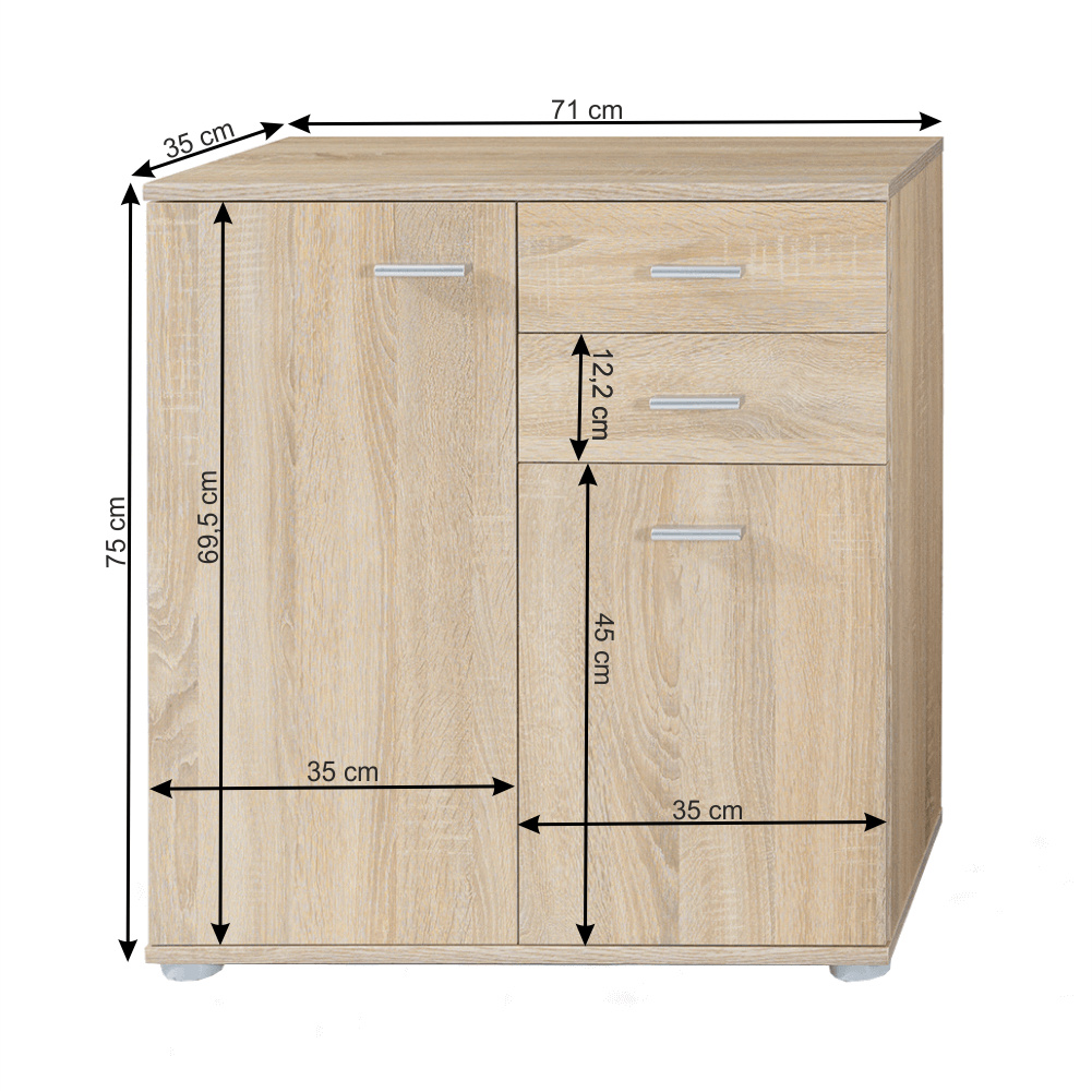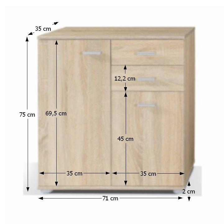 Komoda 2-2T2S se dvěma skříňkami a dvěma šuplíky Materiál: DTD laminovaná Barva: dub sonoma Rozměry (ŠxHxV): 71x35x75 cm Dodávané v demontu.
