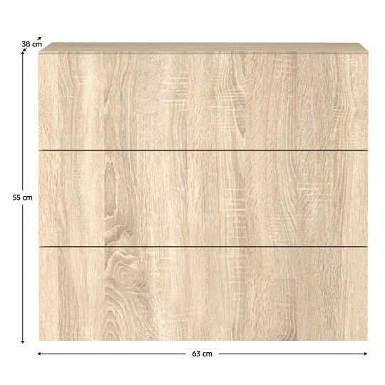 Materiál: laminovaná DTD Barva: dub sonoma Rozměry (ŠxHxV): 63x38x55 cm Tloušťka materiálu DTD: 1,6-2,2 cm Nosnost vrchní desky: 10 kg Závěsná Tři šuplíky Nosnost šuplíku: 3 kg Plnovýsuvné kuličkové ložisko Hrana: papír impregnovaný termosetovými polymery Tloušťka DTD zadní strana/dno zásuvky: 0,3 cm Barva zadní strana/dno zásuvky: dub sonoma Bez úchytek Systém dotykového otevírání PUSH UP Moderní design Doporučujeme připevnit ke zdi Dodáváno v demontu