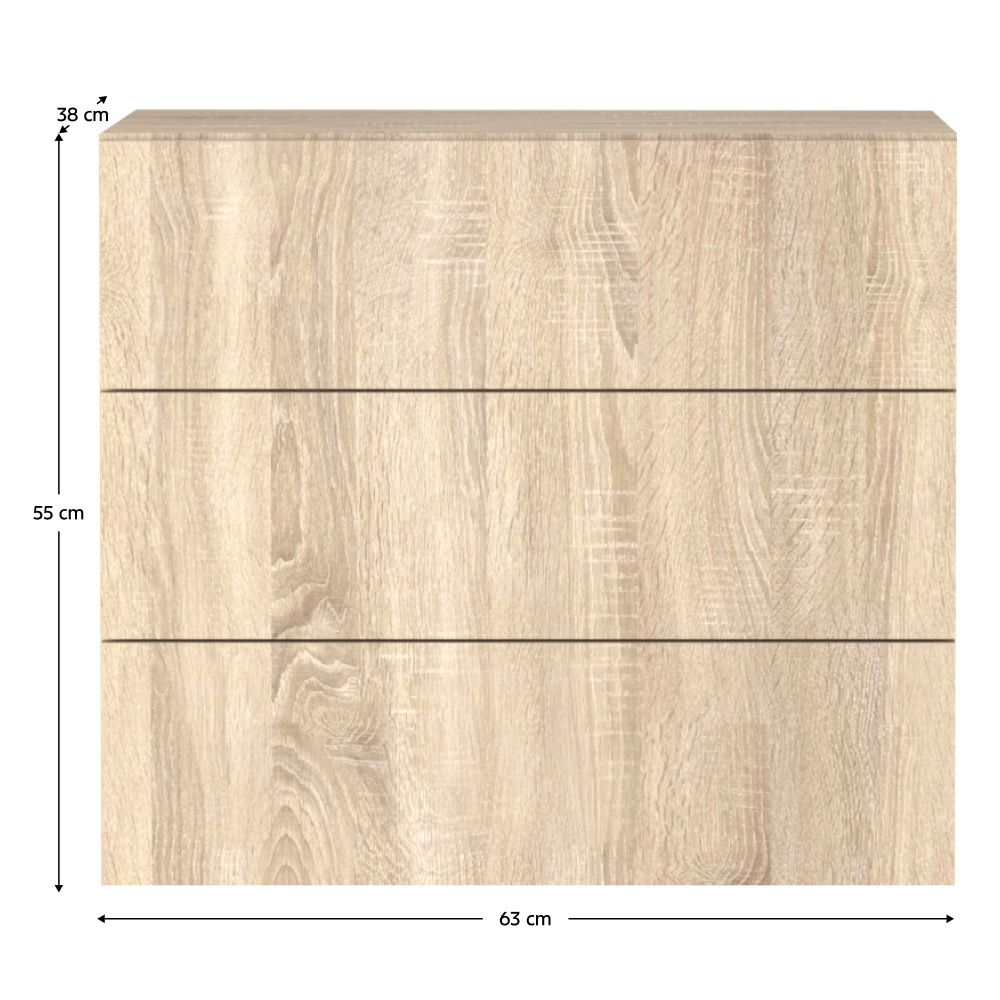 Materiál: laminovaná DTD Barva: dub sonoma Rozměry (ŠxHxV): 63x38x55 cm Tloušťka materiálu DTD: 1,6-2,2 cm Nosnost vrchní desky: 10 kg Závěsná Tři šuplíky Nosnost šuplíku: 3 kg Plnovýsuvné kuličkové ložisko Hrana: papír impregnovaný termosetovými polymery Tloušťka DTD zadní strana/dno zásuvky: 0,3 cm Barva zadní strana/dno zásuvky: dub sonoma Bez úchytek Systém dotykového otevírání PUSH UP Moderní design Doporučujeme připevnit ke zdi Dodáváno v demontu