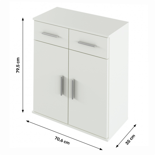 Materiál: DTD laminovaná Barva: bílá Rozměry (ŠxHxV): 70,6x35x79,5 cm dvoudveřová policová dvě šuplíky S úchytkami Dodávané v demontu