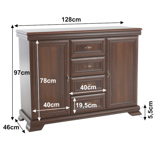 Komoda dvoudveřová s šuplíky, KORA kk3 Materiálové provedení: laminovaná DTD / lišty MDF / kovové úchytky Barevné provedení: samoa king. Rozměry ŠxHxV: 128x46x97 cm. Výška spodního prostoru od podlahy: 10,5 cm Dodávané v demontu.