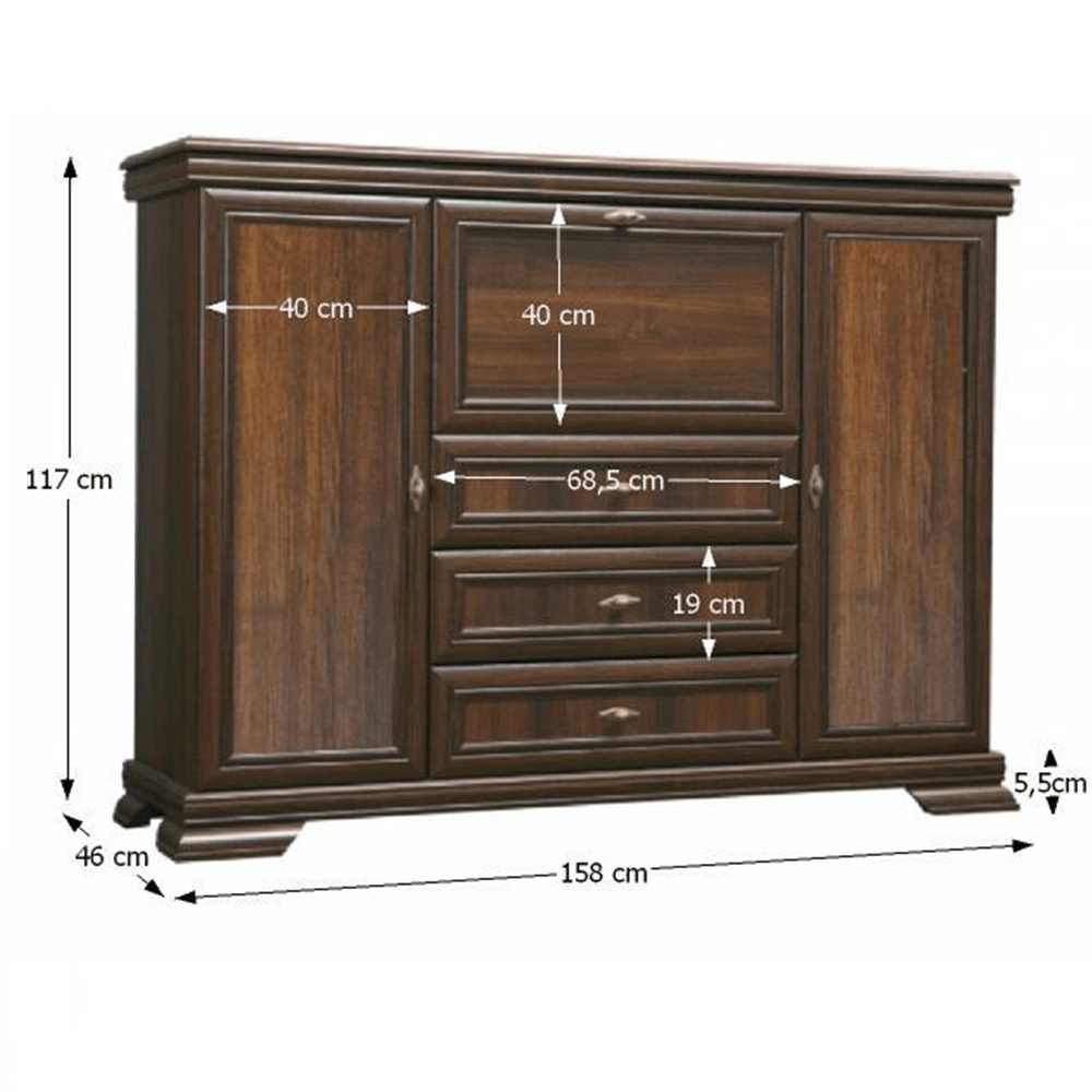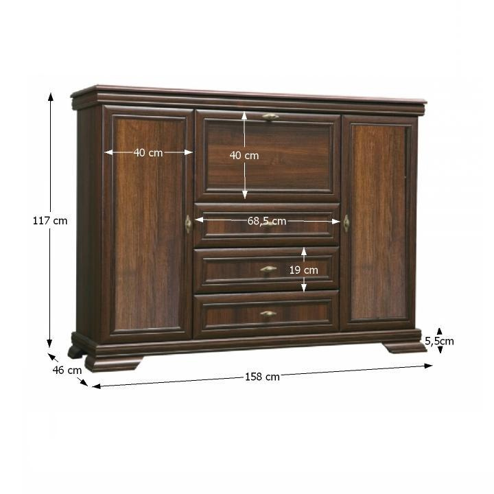 Komoda s barem KORA KK6P Materiál: laminovaná DTD / lišty MDF / kovové úchytky Barva: samoa king Rozměry komody (ŠxHxV): 158x46x117 cm Tloušťka materiálu korpus: 15 mm Tloušťka materiálu vrchní desky: 22 mm Tloušťka materiálu dolní desky: 22 mm Výška spodního prostoru od podlahy: 10,5 cm Dodávané v demontu